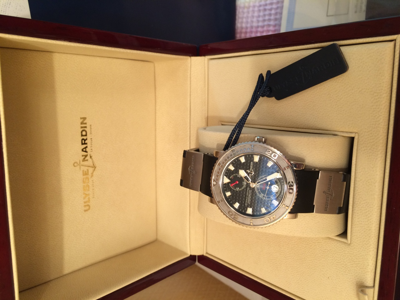 Оригинальные швейцарские часы Хронограф Улисс нардин , практически новые ,стоили в магазине за 9900$, модель Улисс нардин Марин дайвер , Каучуковый ремешок с титановыми вставками , циферблат с цифрами и стрелками из фосфора - светящиеся в темноте , стекло Сапфировое с двухсторонним антибликовым покрытием , вращающийся безель , водонепроницаемые до 300 м глубины Произведены в швейцарии на мануфактуре Улисс нардин , проверка в специализированном магазине Или часовой мастерской