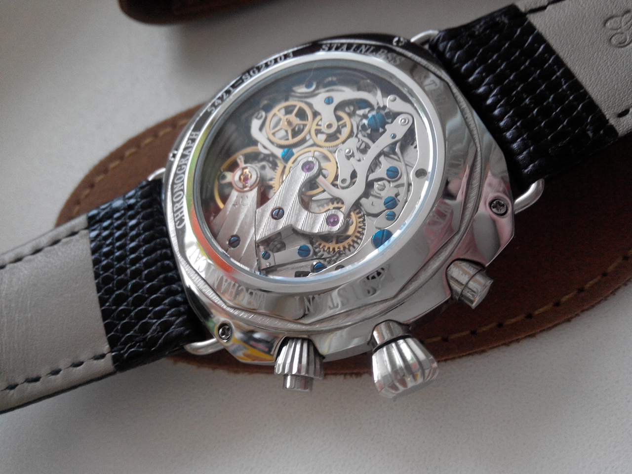 Механизм: SEAGULL SG2903 20-JEWELS MANUAL WIND 30-MIN.TWO REGISTERED CHRONOGRAPH MOVEMENT, GLOSSY POLISHED PARTS WITH BLUE STEEL SCREW & COLUMN WHEEL.