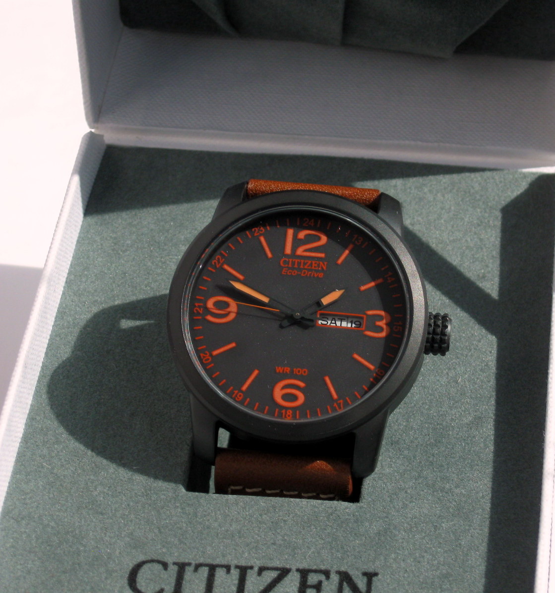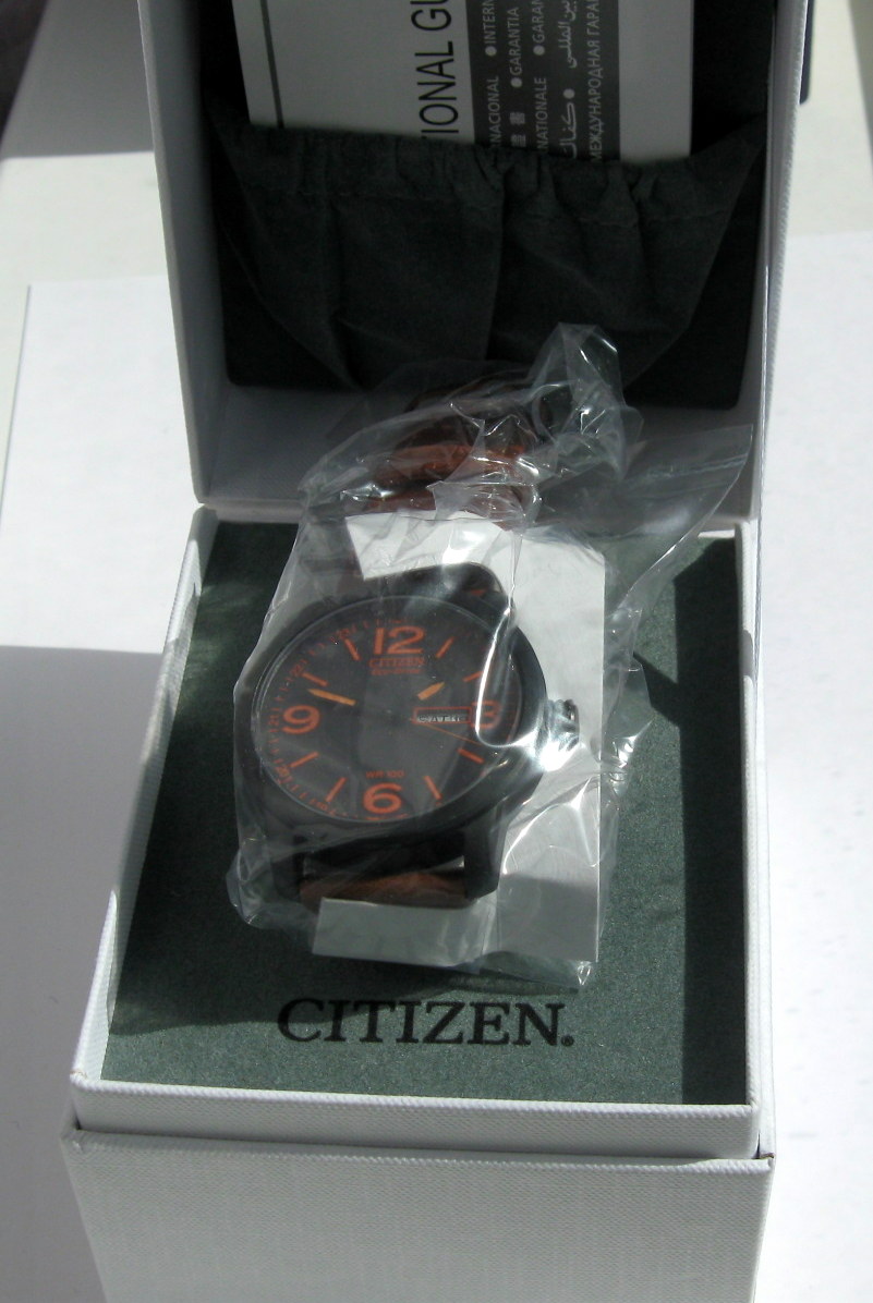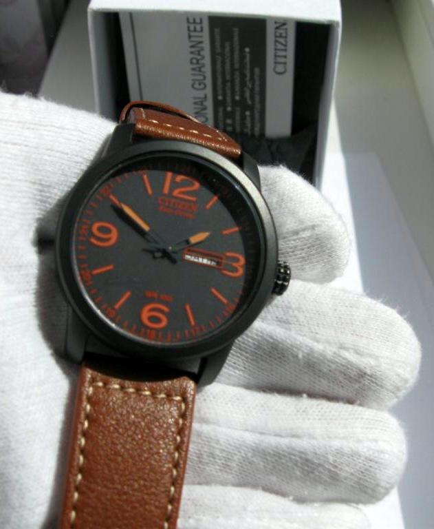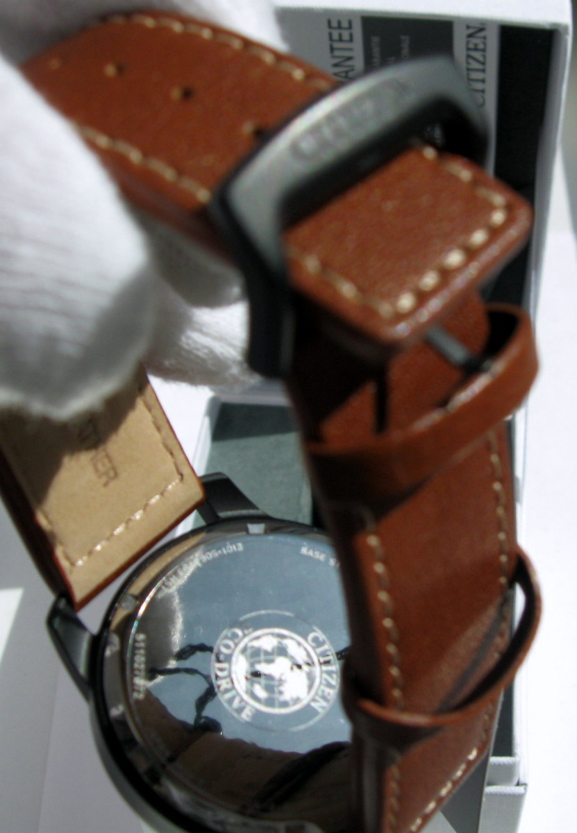 Модель BM8475-26E имеет минеральное стекло, кожаный ремешок коричневого цвета, чёрный циферблат.