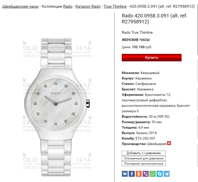 [Женские] Rado True Thinline / белая керамика / Бриллианты - Часовой форум Watch.ru