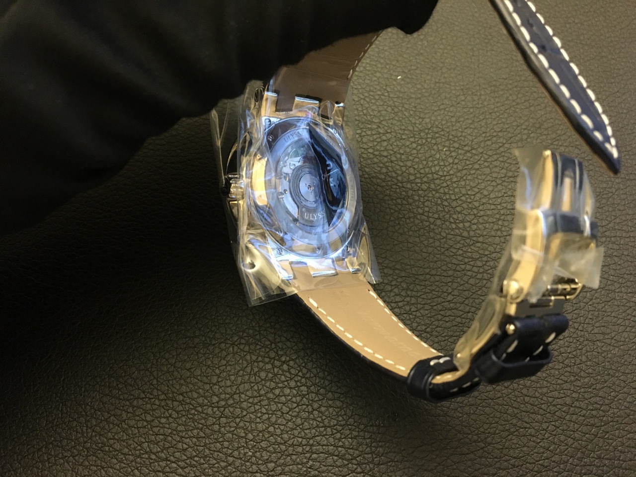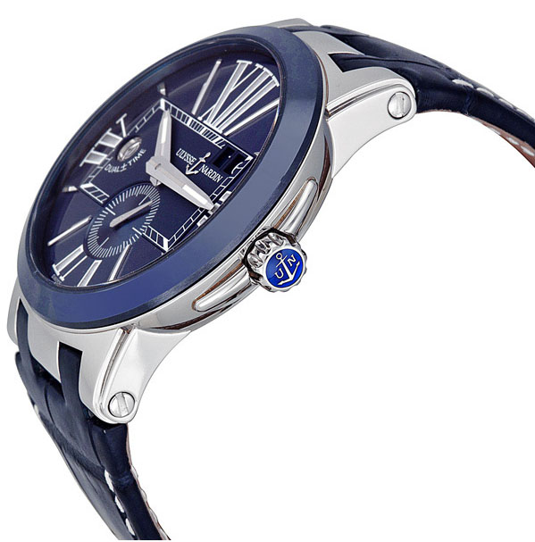 В 2012 году компания Ulysse Nardin выпустила новую модель часов – Executive Dual Time, оснащенную запатентованной системой переключения второго часового пояса. Окошко даты в положении на 2 часа. Окошко домашнего времени в положении на 9 часов. С помощью кнопок второго времени на 10 часов добавляя +1 часовой пояс и на 8 часов отнимая -1 часовой пояс, при нажатии этих кнопок механизм мгновенно переключает центральные стрелки в том часовом поясе, в котором сейчас Вы находитесь, а в окошке на 9 часов, всегда остается Ваше домашнее время. В отличие от прошлогодней модели, доминирующий цвет новинки – синий. На ярко-синем циферблате выделяются стальные крупные римские цифры и центральные стрелки, на 6 часах расположен боковой секундный циферблат, у отметки 2 часа двойная апертура даты. Время во втором часовом поясе отображается в маленькой апертуре на 9 часах. Корпус с гладким синим безелем и кнопками переключения второго часового пояса на 8 и 10 часах выполнен из керамики выполнен из нержавеющей стали. Ремешок из кожи крокодила.