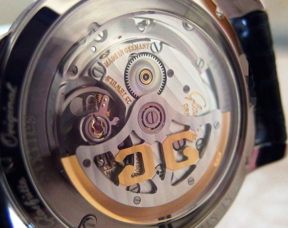 Мануфактурный калибр 39-52 . Обеспечивает индикацию часов, минут и секунд. 25 камней, запас хода - 40 часов, частота колебаний - 28800, 3/4 платина с декорацией "Гласхютинские волны" и с регулятором "лебединая шея". Механизм снабжен скелетонизированым ротором с двойным лого G и утяжелителем из золота. Диаметр механизма 31.6 мм и - это единственный момент, который мне не очень нравится в часах. Даже в этом небольшом корпусе механизм выглядит "мелковатым".