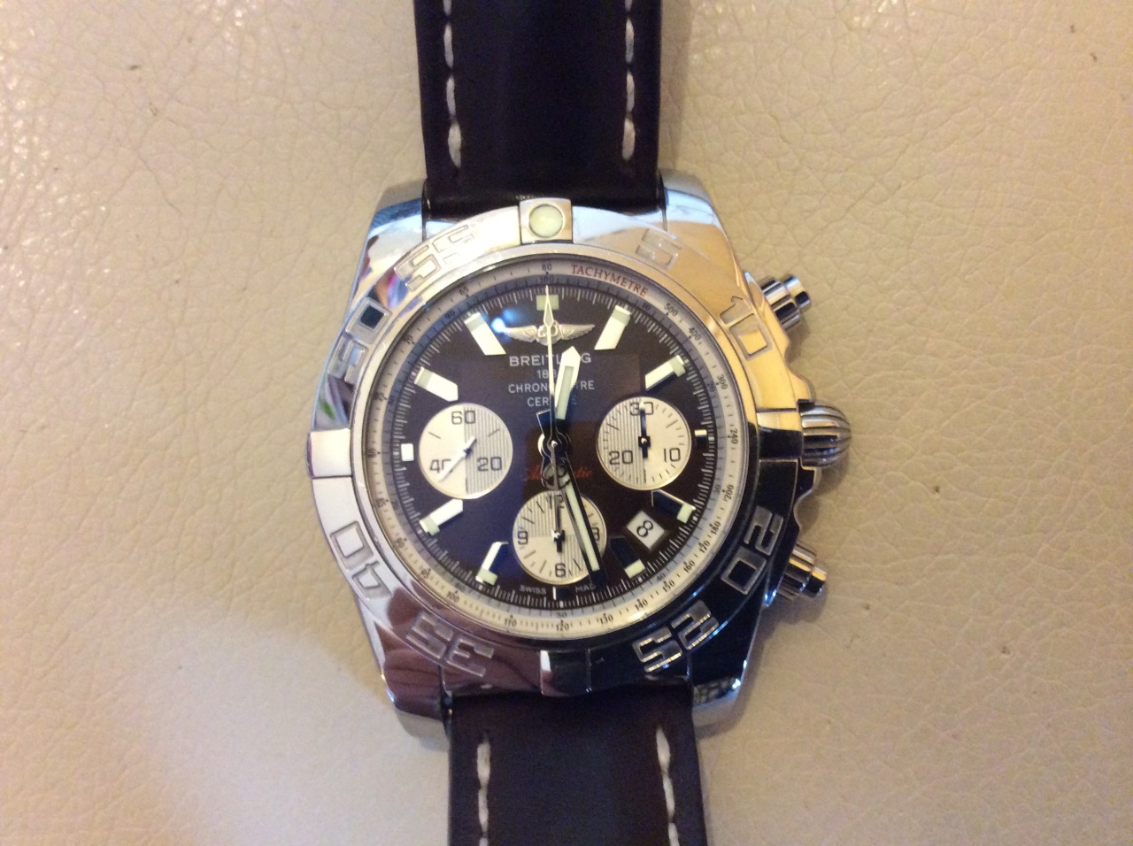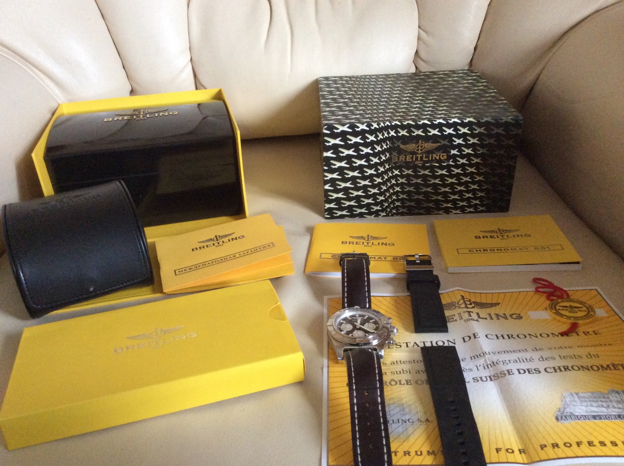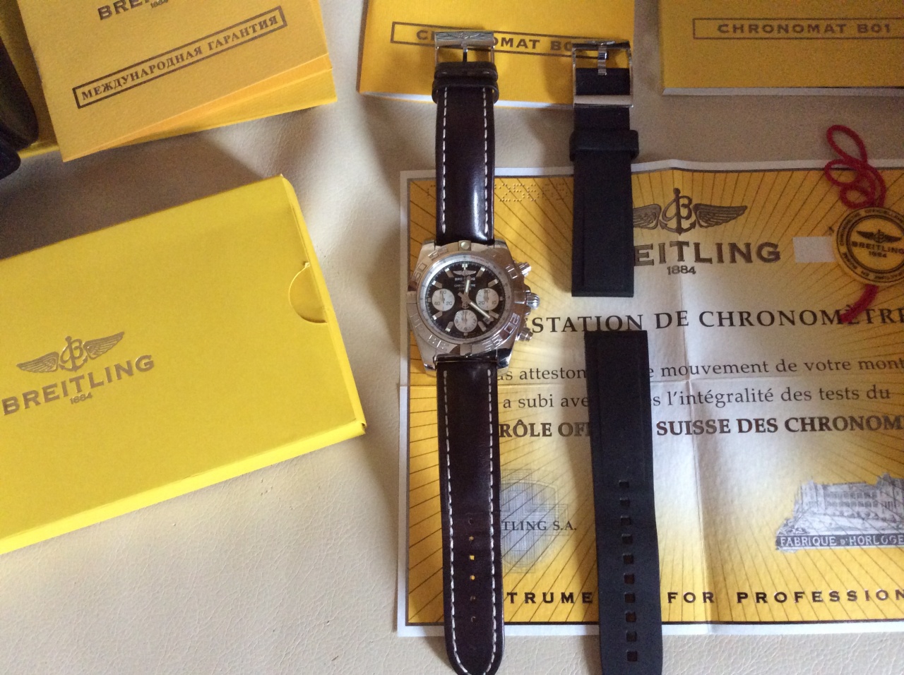 Продаю Breitling Chronomat B01, часы в отличном состояние, есть следы носки, но ничего критического. Часы покупались в Меркури 25.12.12 на каучуке, сейчас на коричневом ремешке. Цифер коричневого цвета, но визуально смотрится черным. Полный комплект, смотрите фото. Каучука, что на фото уже нет.