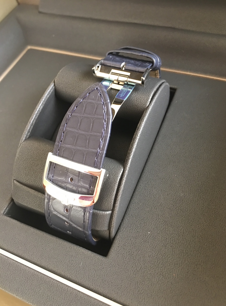 Ремень синий аллигатор, довольно толстый у оснований, поэтому необходимо некоторое время, чтобы часы легли на кисть. Кстати, удивило наличие системы удобной смены ремня: