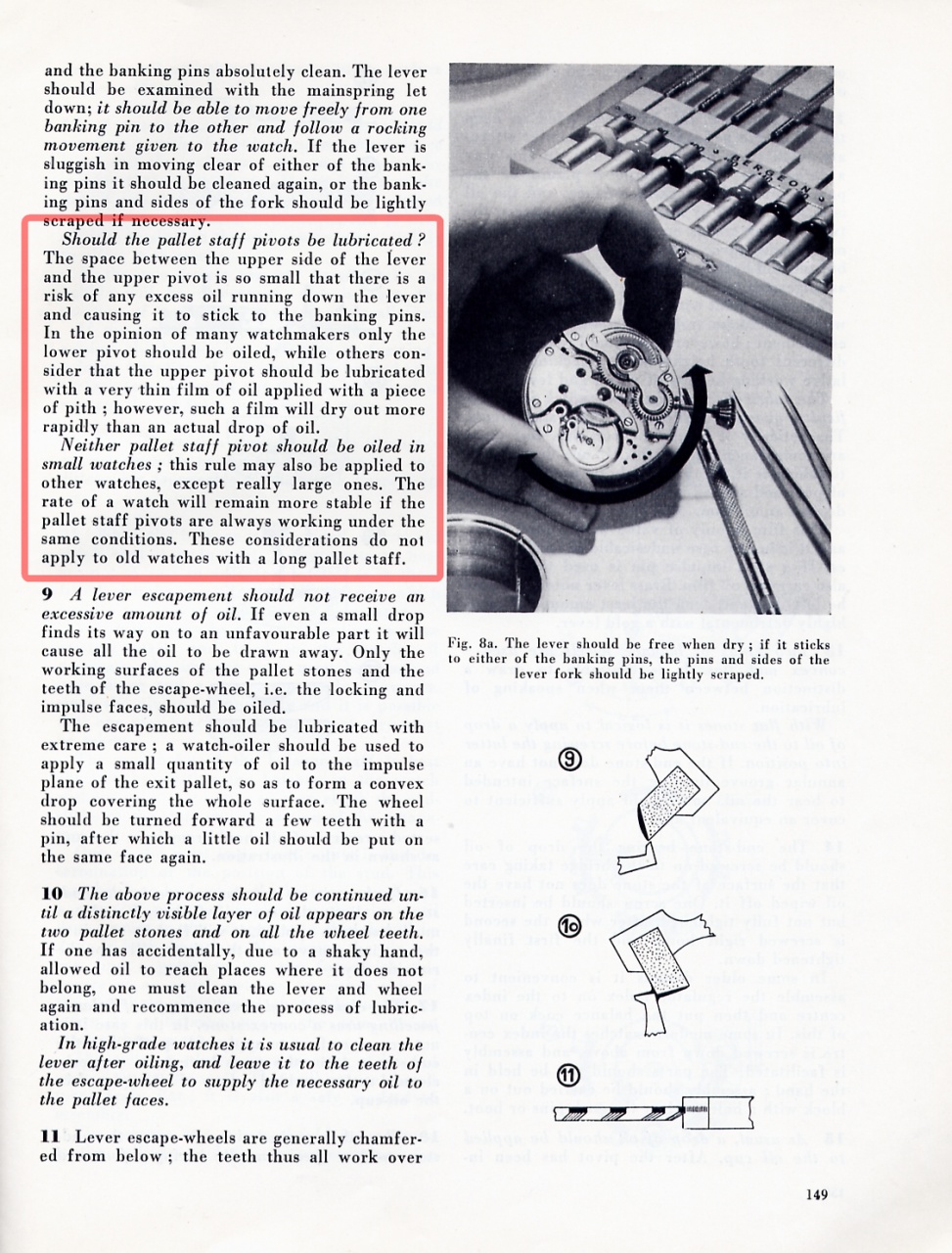 Henry B. Fried также советует смазывать, нижнюю цапфу обязательно, верхнюю только очень слегка. Вопрос является частично спорным в очень маленьких калибров, поэтому нам надо следовать рекомендациям производителя, если таковые есть.