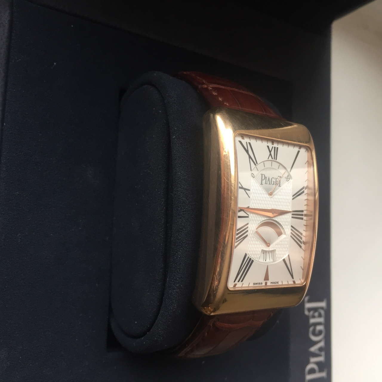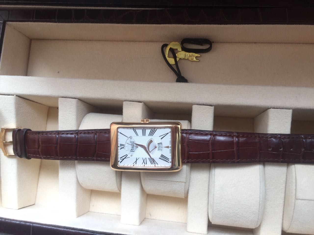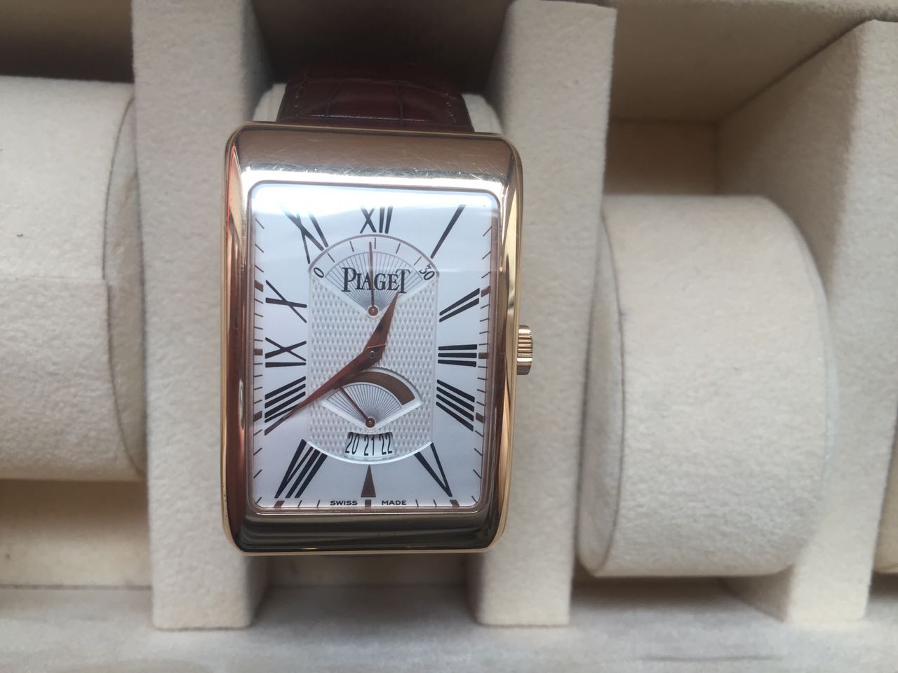 Часы Piaget Rectangle à l’Ancienne, 31 х 46 мм. Корпус из розового золота 18 карат. Мануфактурный механизм с автоматическим подзаводом Piaget 561P.