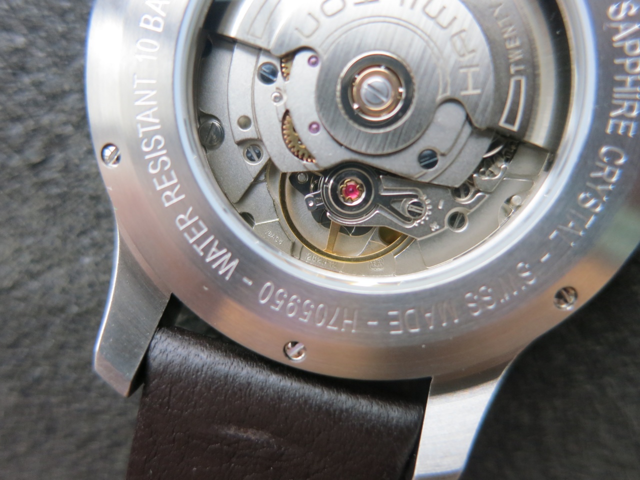 Данная модель часов с механизмом ETA 2824-2 (25 камней и 28800 полуколебаний в час, запас хода 38 часов). С целью увеличения запаса хода компания Hamilton меняет калибры механизмов у своих часов, т.е. меняет ETA 2824-2 на ETA C07.611 (H-10), а это уже снижение частоты до 21600 полуколебаний в час, уменьшение диаметра оси заводного барабана и увеличение длина пружины, но зато это уже увеличение запаса хода до 80 часов. В целом качество часов и механизмов у Hamilton не изменилось и осталось на достаточно высоком уровне.