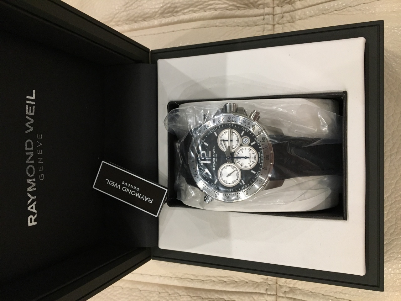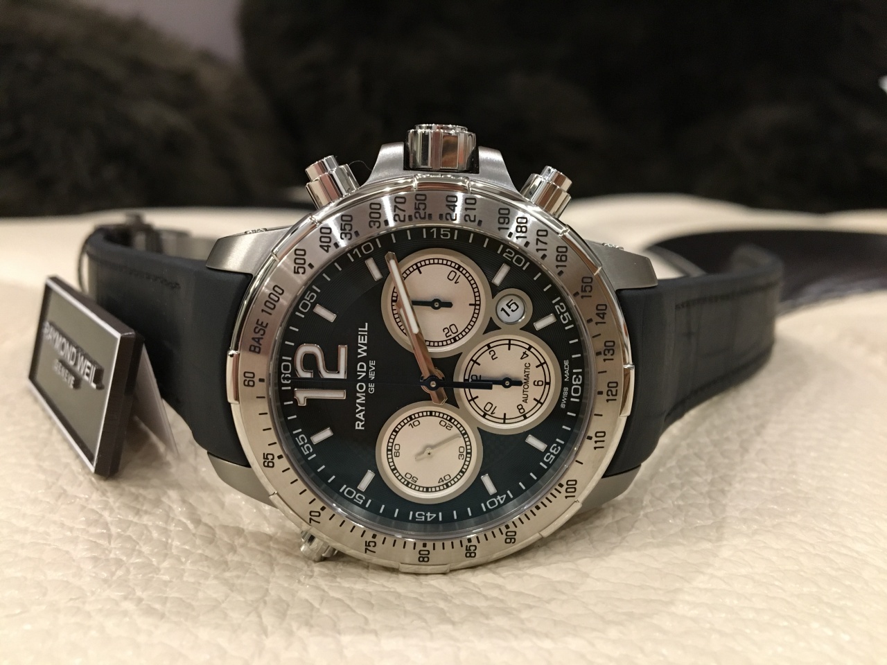Часовой механизм: механический хронограф с автозаводом Raymond Weil 5010 (базовый калибр ETA 7753), 27 камня, балансовая частота 28800 полуколебаний в час.