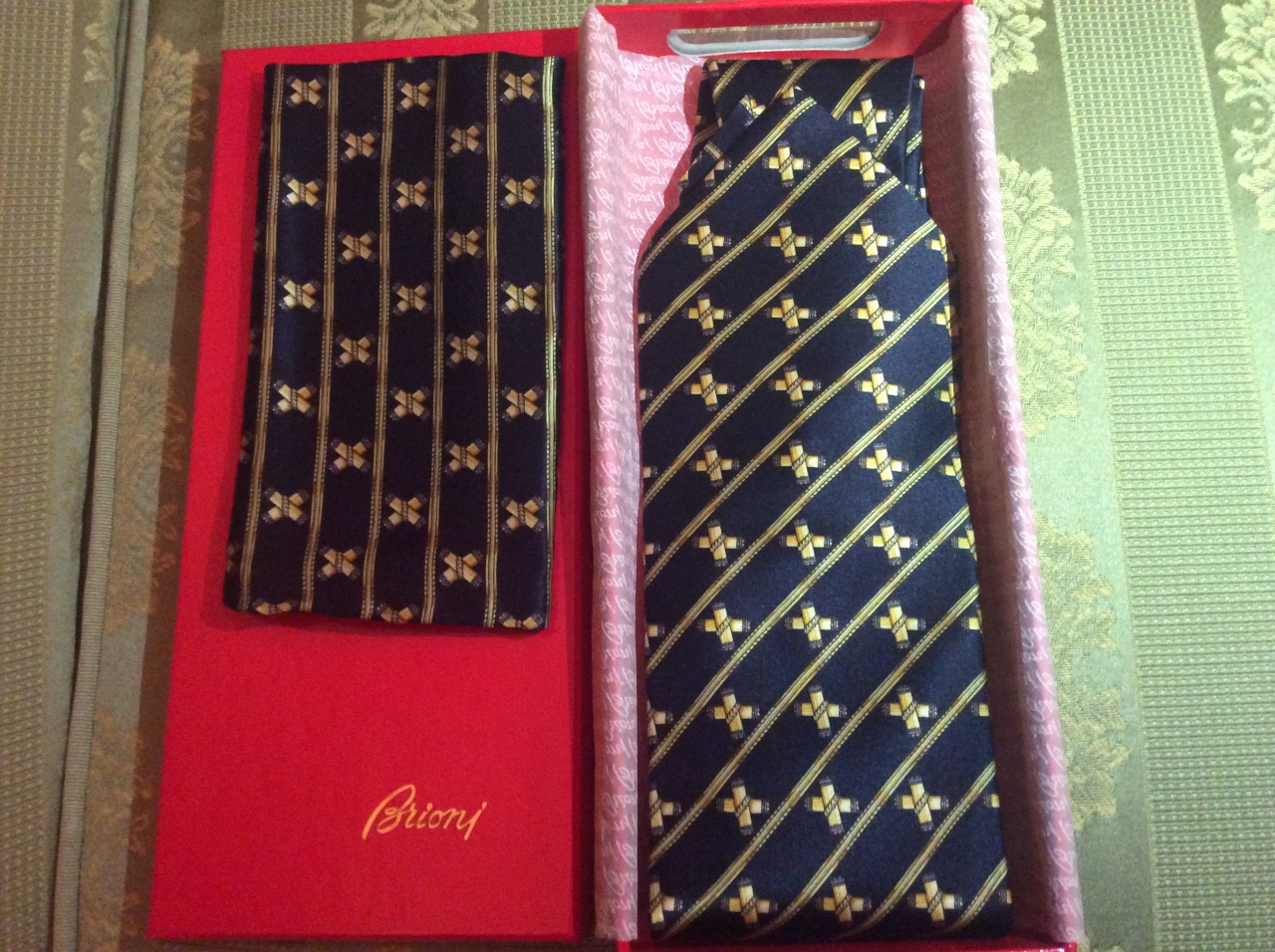 Продается новый эксклюзивный шелковый галстук BRIONI + карманный платок-паше в наборе . Мужской галстук и платок BRIONI выполнены в ручную из мягчайшего шелка . Модель характеризуется фирменной нашивкой бренда на оборотной стороне. Галстук сшит из единого отреза ткани и с легкостью завязывается в любой узел благодаря плотности шелка. Роскошное качество!Самые дорогие галстуки в бутике BRIONI .