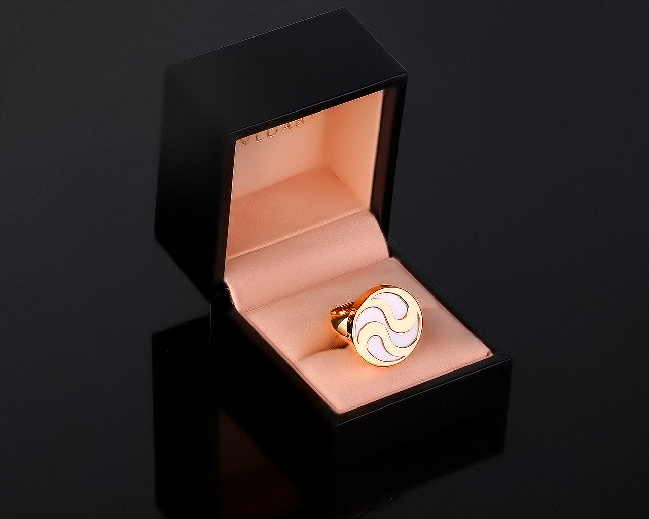 Представляем вашему вниманию вращающееся золотое кольцо с белым перламутром Optical от всемирно известного бренда Bvlgari.