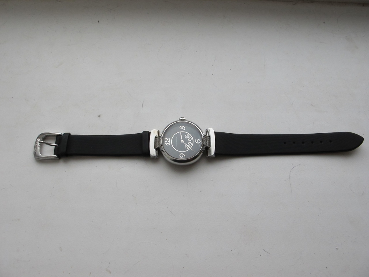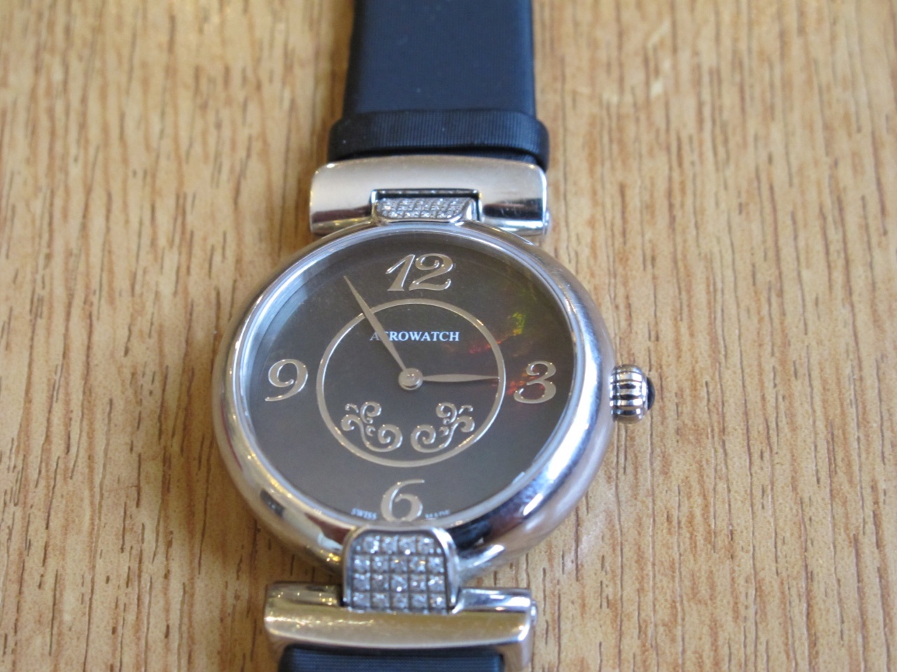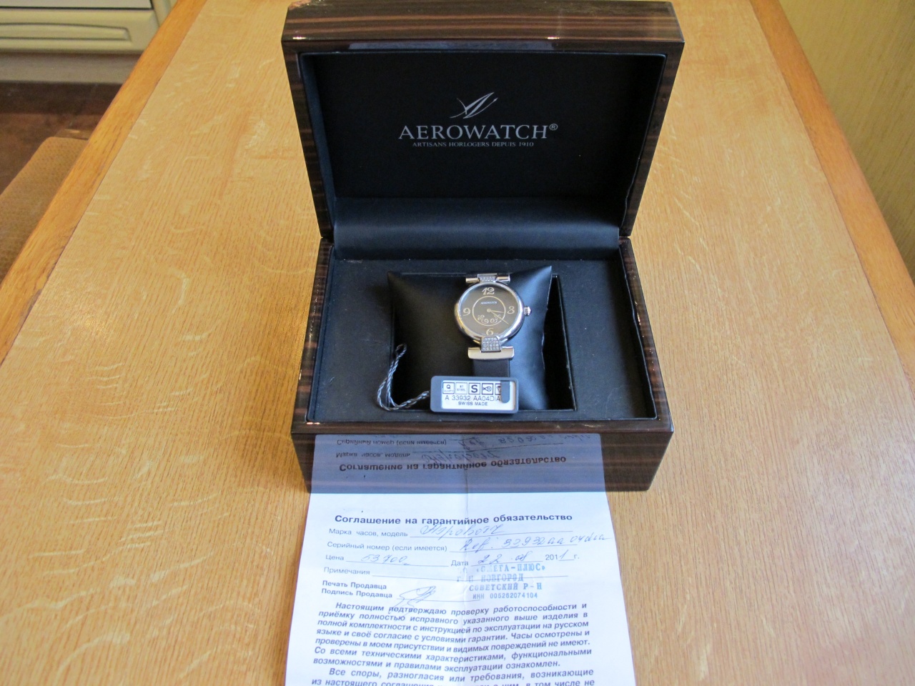 Продаю часы женские Aerowatch Harlequin Daimond Flowers. Swiss made. Ref.№ 33932-AA04-DIA. Куплены в 2011г, носились мало, состояние оч.хорошее. Механизм Ronda 1062 кварцевый. Источник энергии - батарейка (в декабре 2016г установлена новая, срок службы 4-5 лет). Корпус из нержавеющей стали 316L, декорированный 38 бриллиантами 0,29k (на корпусе есть малозаметные потертости и царапинки, которые убираются полировкой). Заводная головка с кабошоном из черного агата. Циферблат из черного натурального перламутра (смотрится очень хорошо, переливается на свету). Цифры - арабские, стальные. Диаметр корпуса - 34 мм., толщина - 9 мм. Стекло - сапфировое, изогнутое (в идеальном состоянии). Ремешок - комбинированный сатин/кожа ручной работы, новый (заменен в январе 2017г, с ним часы на руку не одевались). Водозащита - 5 Atm. Коробка - есть. Отправлю в любой город РФ.