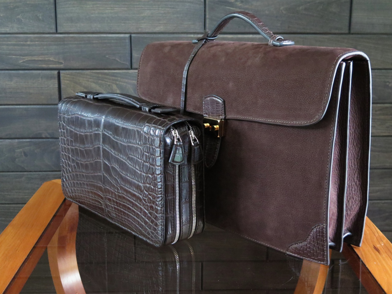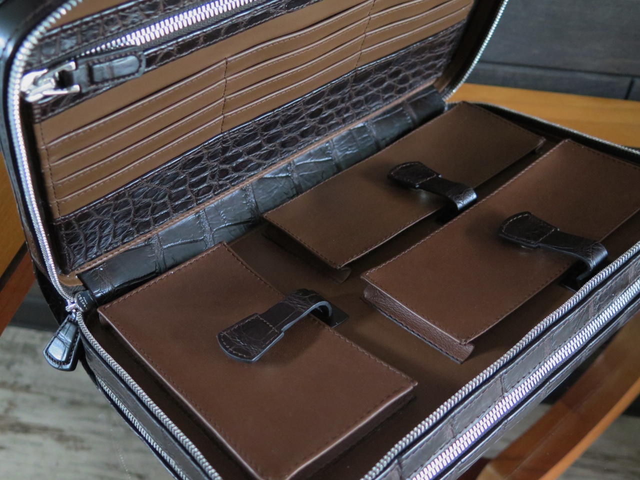 Второе отделение имеет вместительный карман, изготовленный из кожи миссисипского аллигатора, застегивающийся на небольшой замочек, и предназначенный для переноски планшетного компьютера типа iPad Mini или документов, 1 карман для хранения двух паспортов, отделения-хлястики для трех авторучек, три отделения для авто документов (тех.талон, водительские права) или визитных карточек.