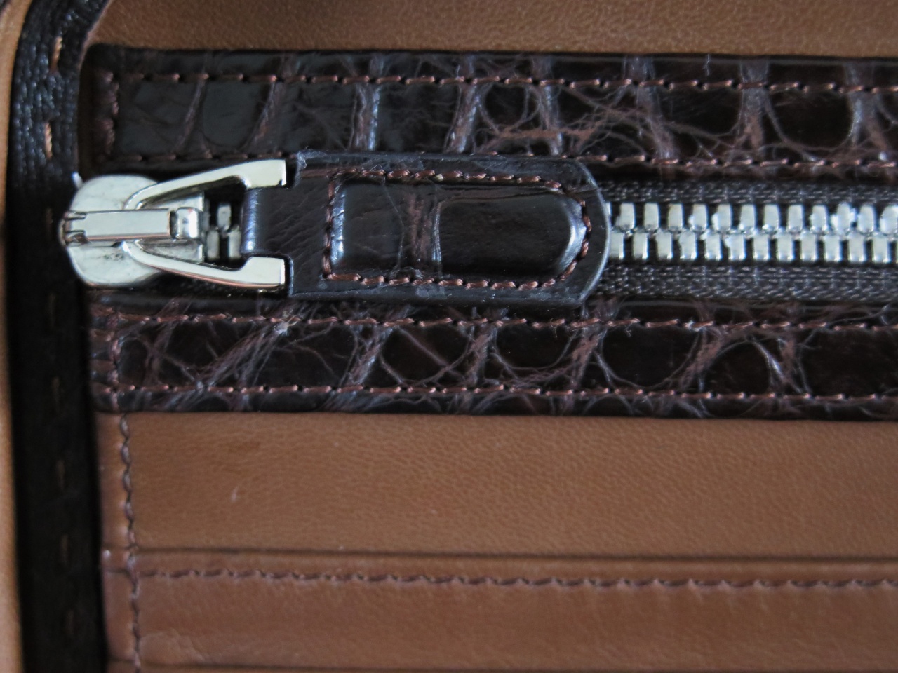 Первое отделение имеет отдел для небольших документов, застёгивающийся на молнию с бегунком из аллигатора, 15 отделений для кредитных карт или визиток, и три отделения-кармана с магнитной застежкой на ремешке из аллигатора для переноски пачек банкнот или телефонов формата iPhone Plus, небольших документов.