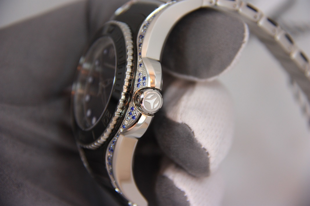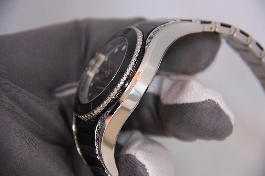 Корпус украшен 102 бриллиантами и голубыми сапфирами.