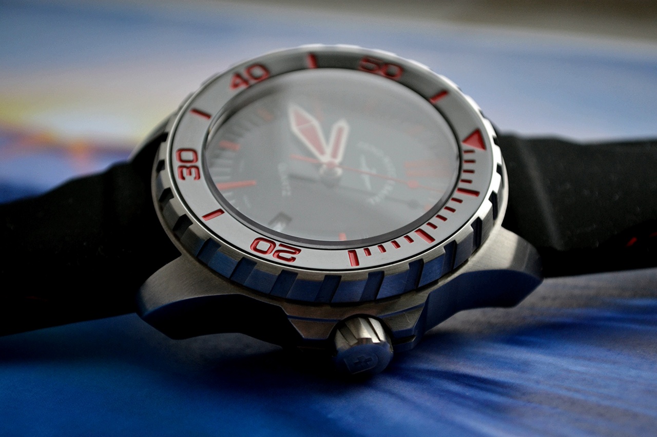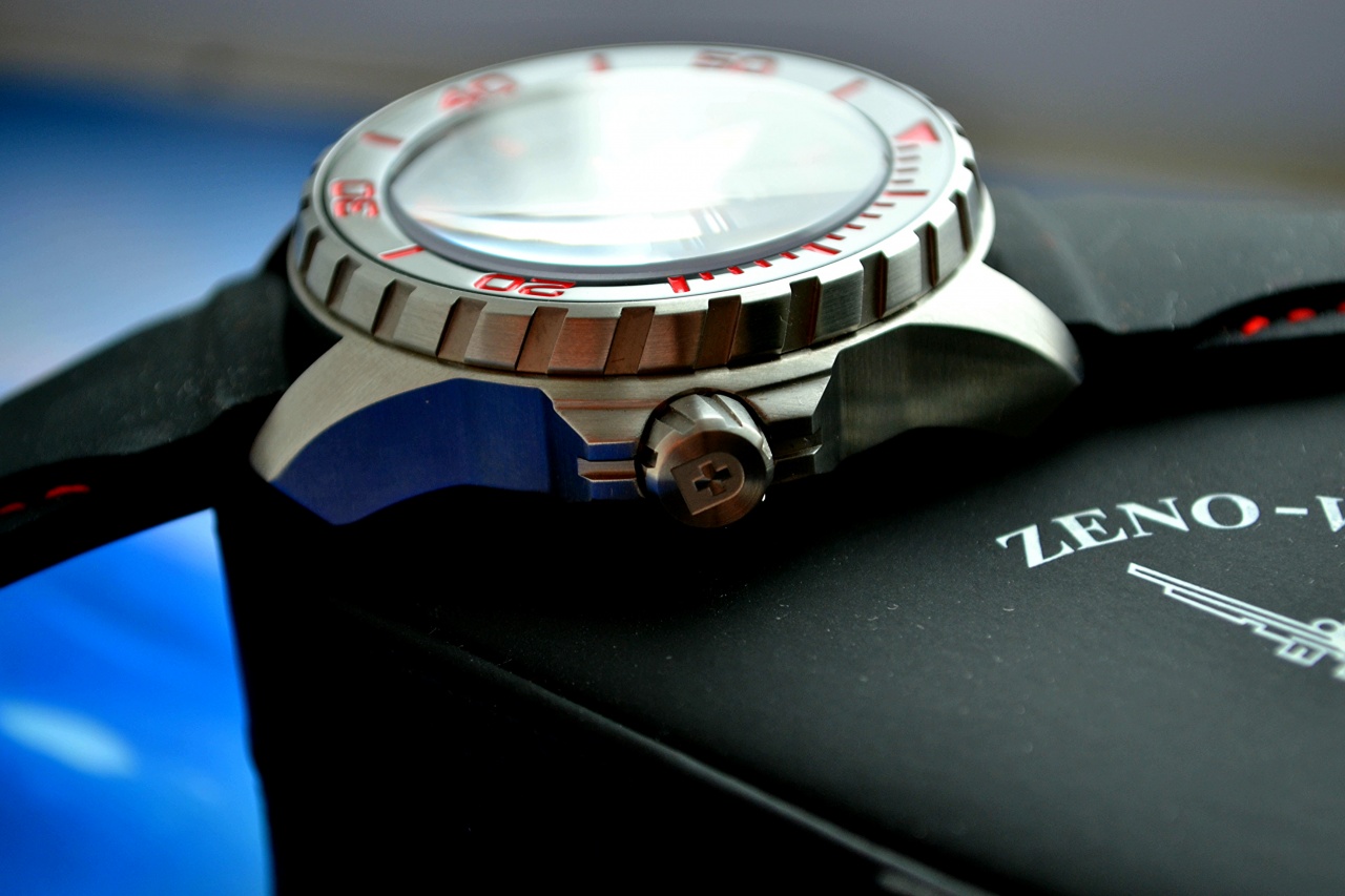 Заводная головка крупная с логотипом бренда, крепление к корпусу резьбовое. С левой стороны имеется гелиевый клапан для глубоководных погружений.