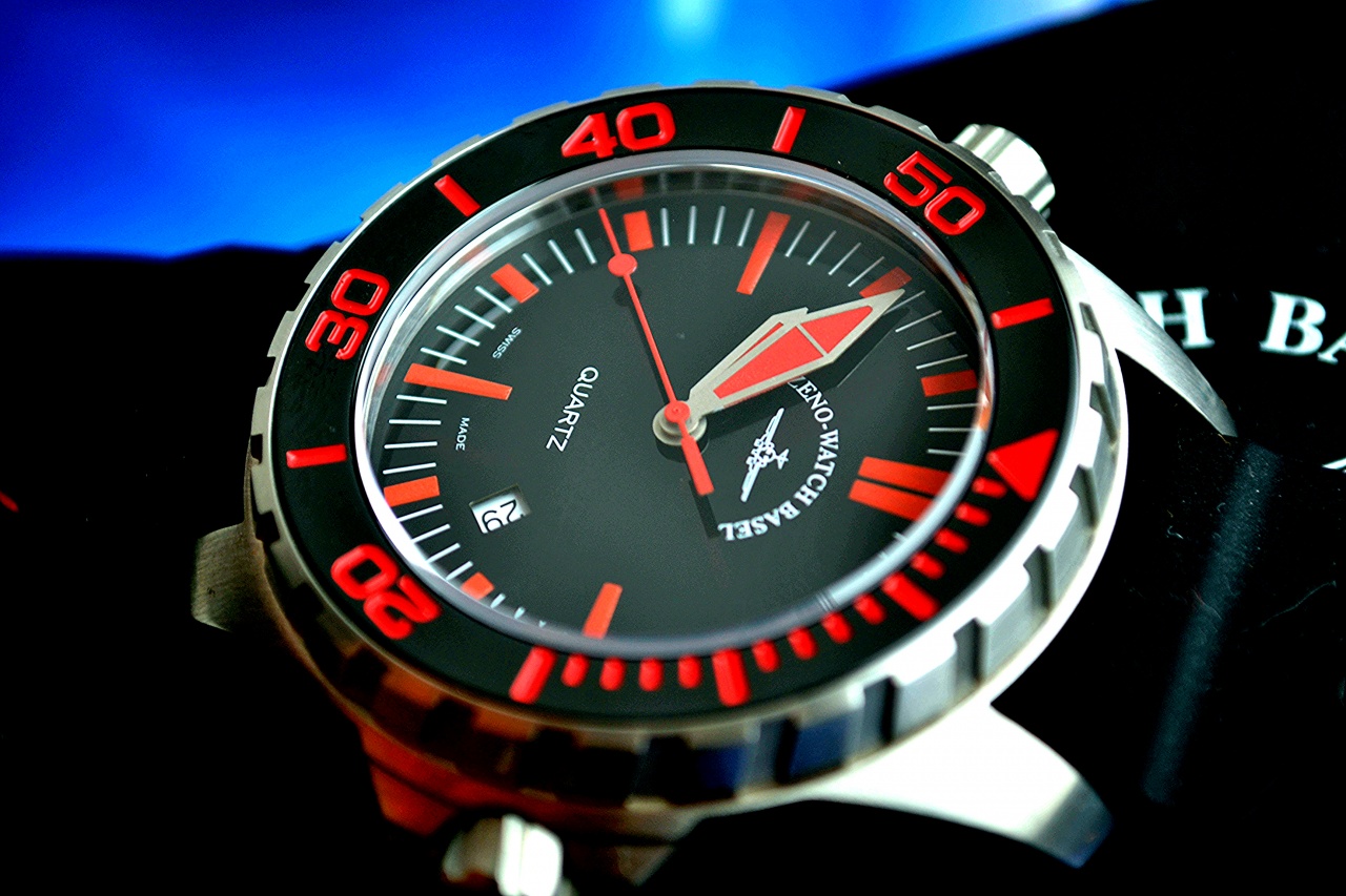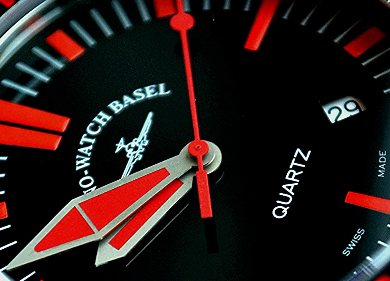 Циферблат черный с красными метками. Стрелки здоровенные красного с белым цвета.