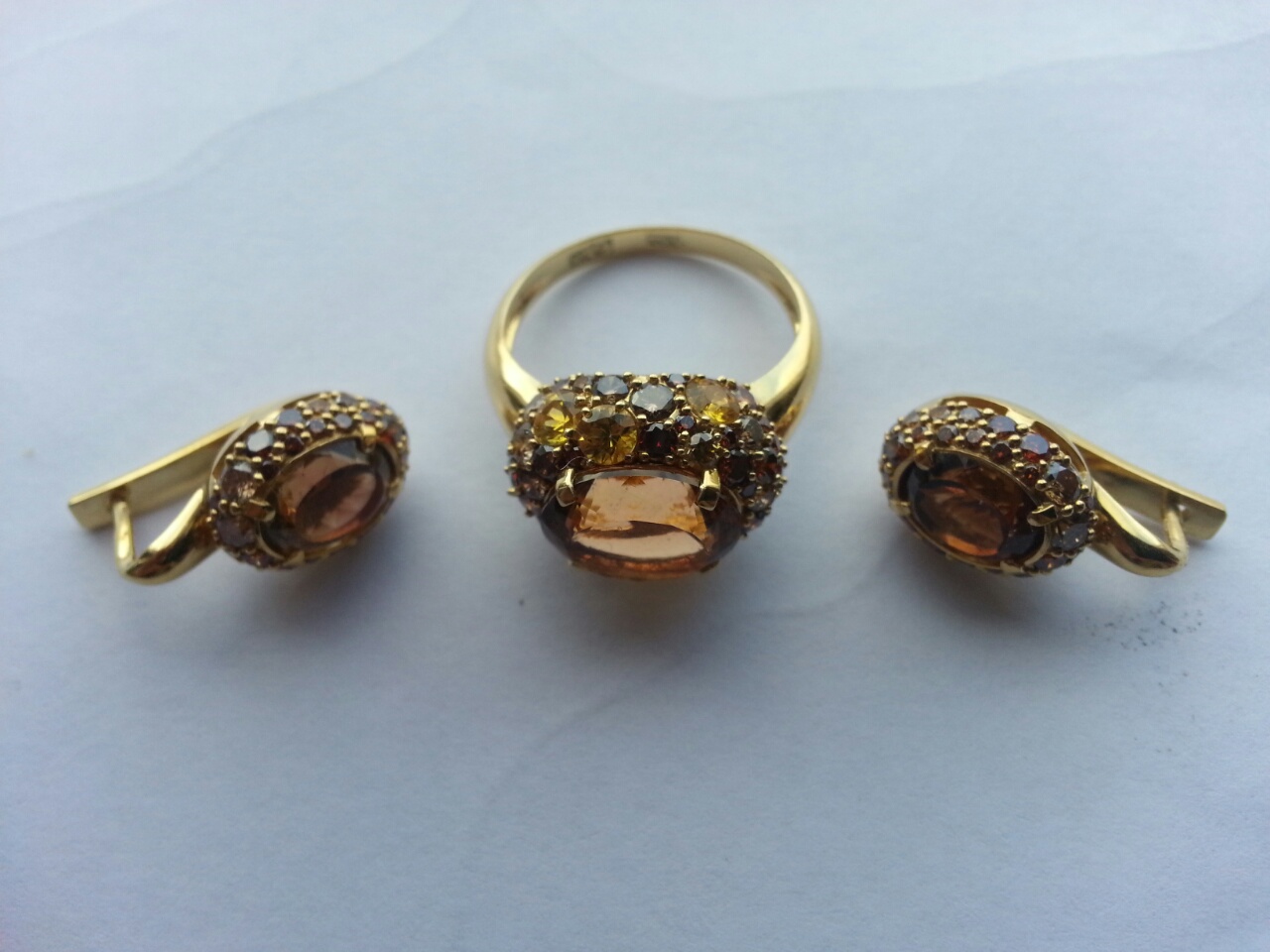 Продаю по просьбе друга красивейший комплект серьги плюс кольцо. Золото 750-ой пробы, бриллианты, турмалины. Покупался на Новый, 2014 год. Только примерялся и не носился. Покупался за 500 с лишним тысяч в бутике De Valeur в Челябинске эксклюзивный единичный дизайн,второго такого нет !!! По тем ценам это было больше 15000 долларов! Описывать нет смысла - все видно на фото. Цену поставим 300000 руб-60% от той, докризисной, цены!