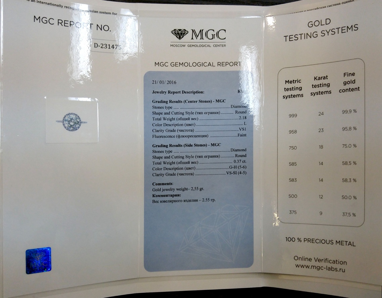 Кольцо из белого золота с бриллиантами 2,55 карат (сертификат МГЦ)