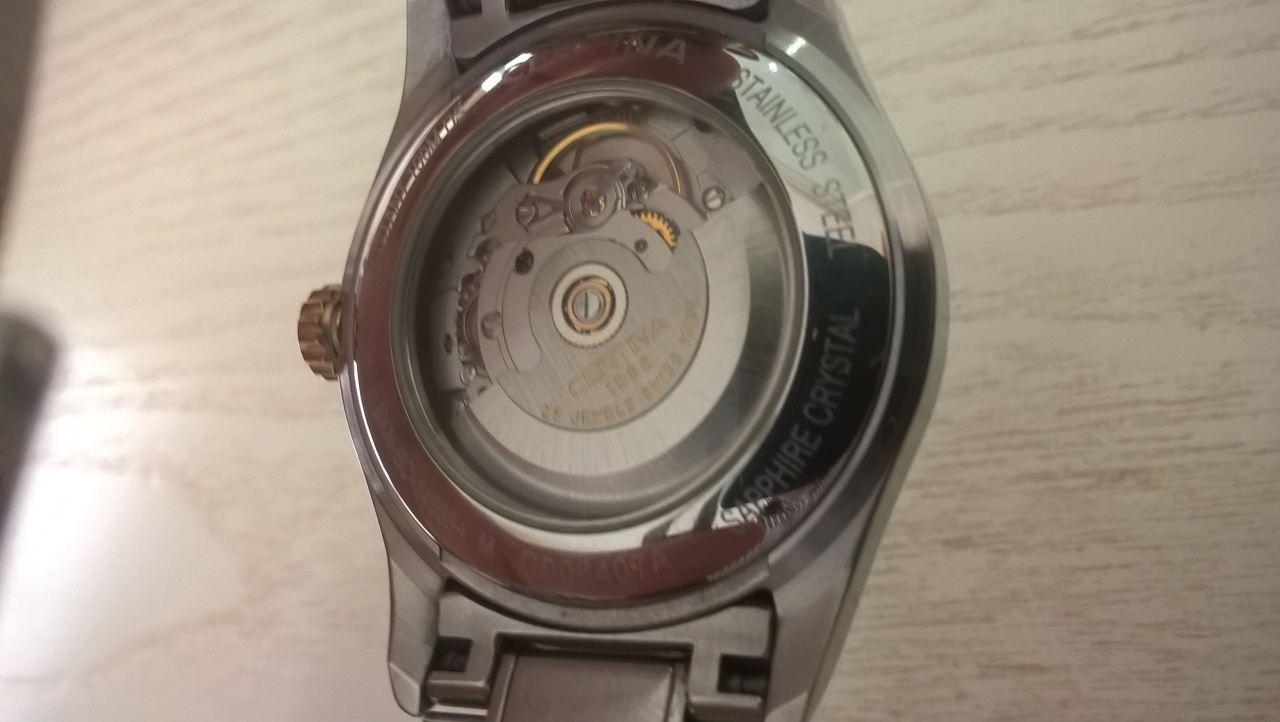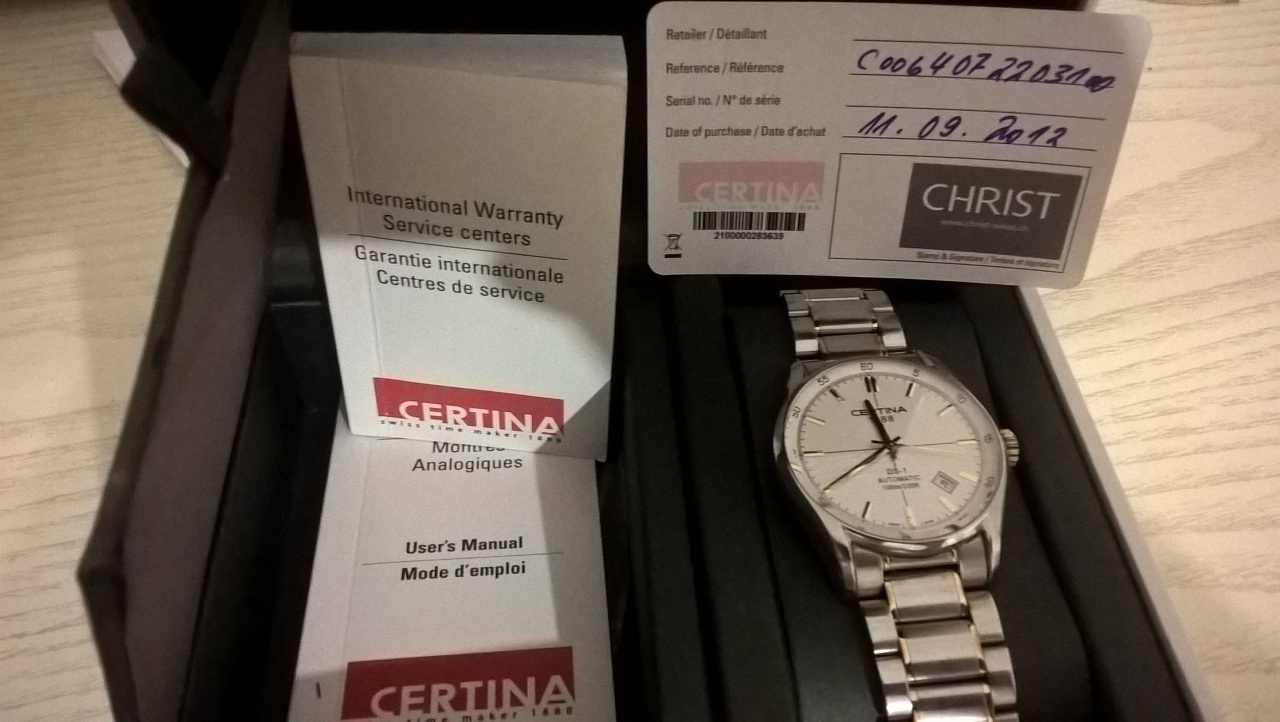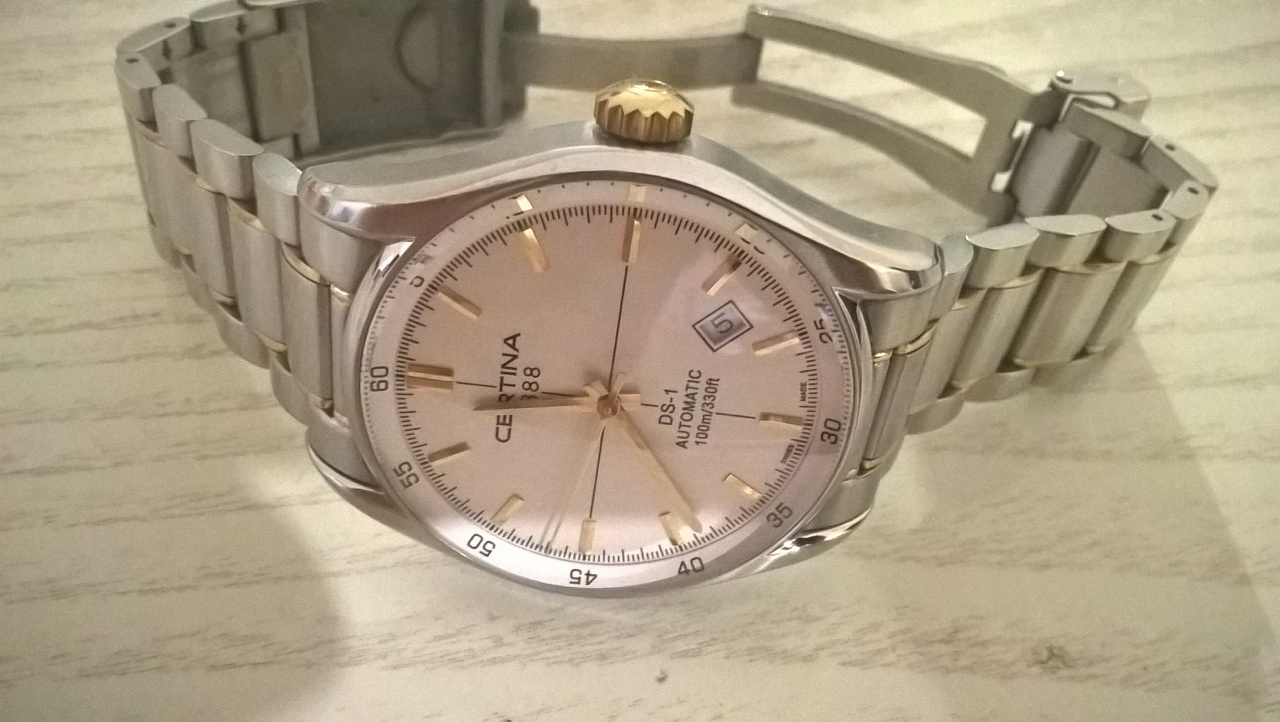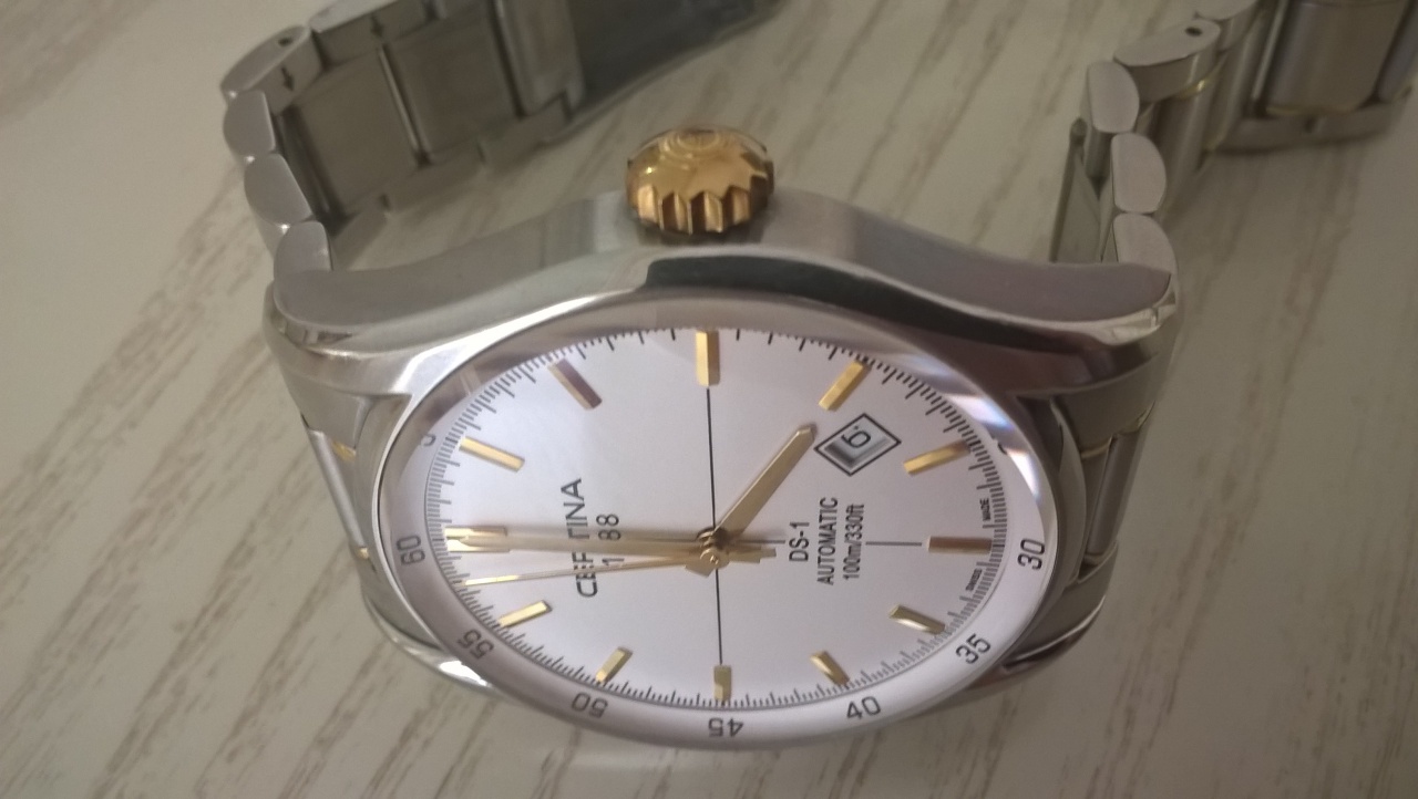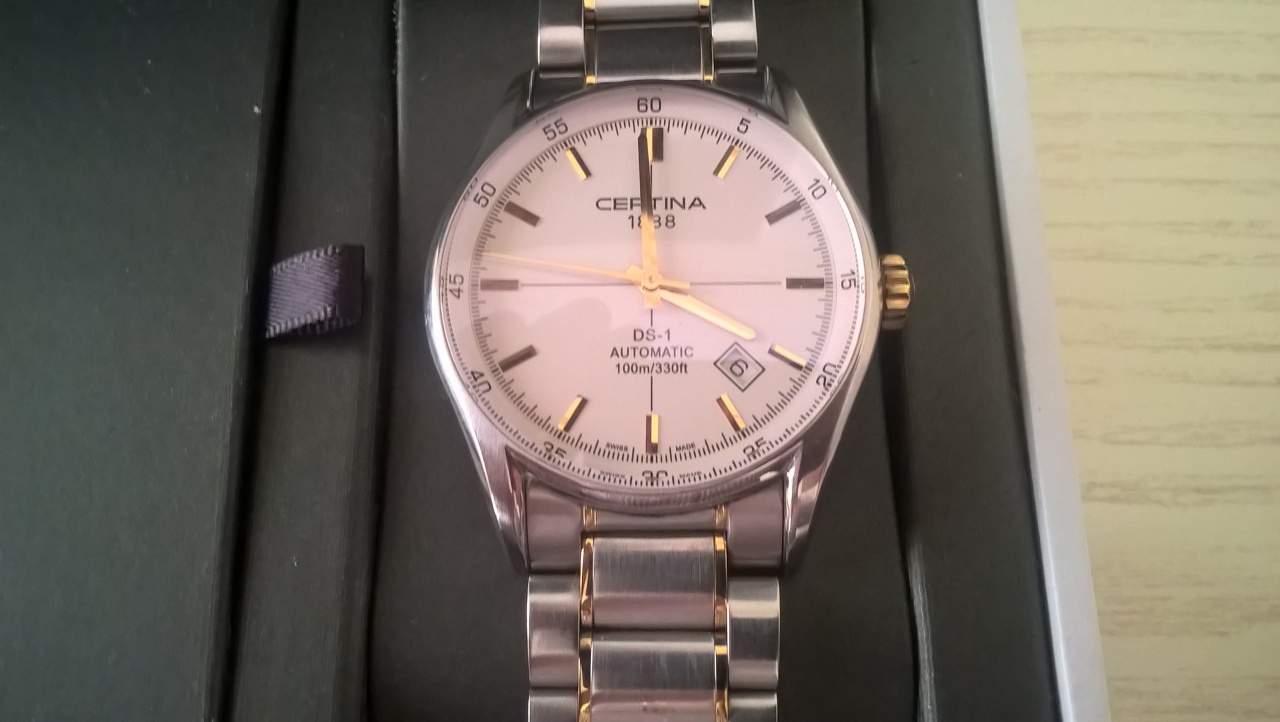 Продаю отличные швейцарские часы CERTINA DS 1 Automatic. Мужские механические наручные часы. Корпус этих часов 39 мм выполнен из нержавеющей стали L316 металлического цвета. Комбинация полированного и сатинированного металла, литой браслет, редкое оформление. Циферблат белоснежного цвета с золотистыми часовыми метками. Золотистые вставки на браслете. Сапфировое стекло с антибликовым покрытием, прозрачная задняя крышка. Калибр механизма: ETA 2824-2. Класс водозащиты: 100 м / 10 АТМ (разрешается плавание и ныряние без акваланга). Дополнительные функции и особенности: отображение числа. Полная заводская комплектация CERTINA: оригинальные часы, фирменная коробка, инструкция, сервисная книжка. Производство и сборка: Швейцария.