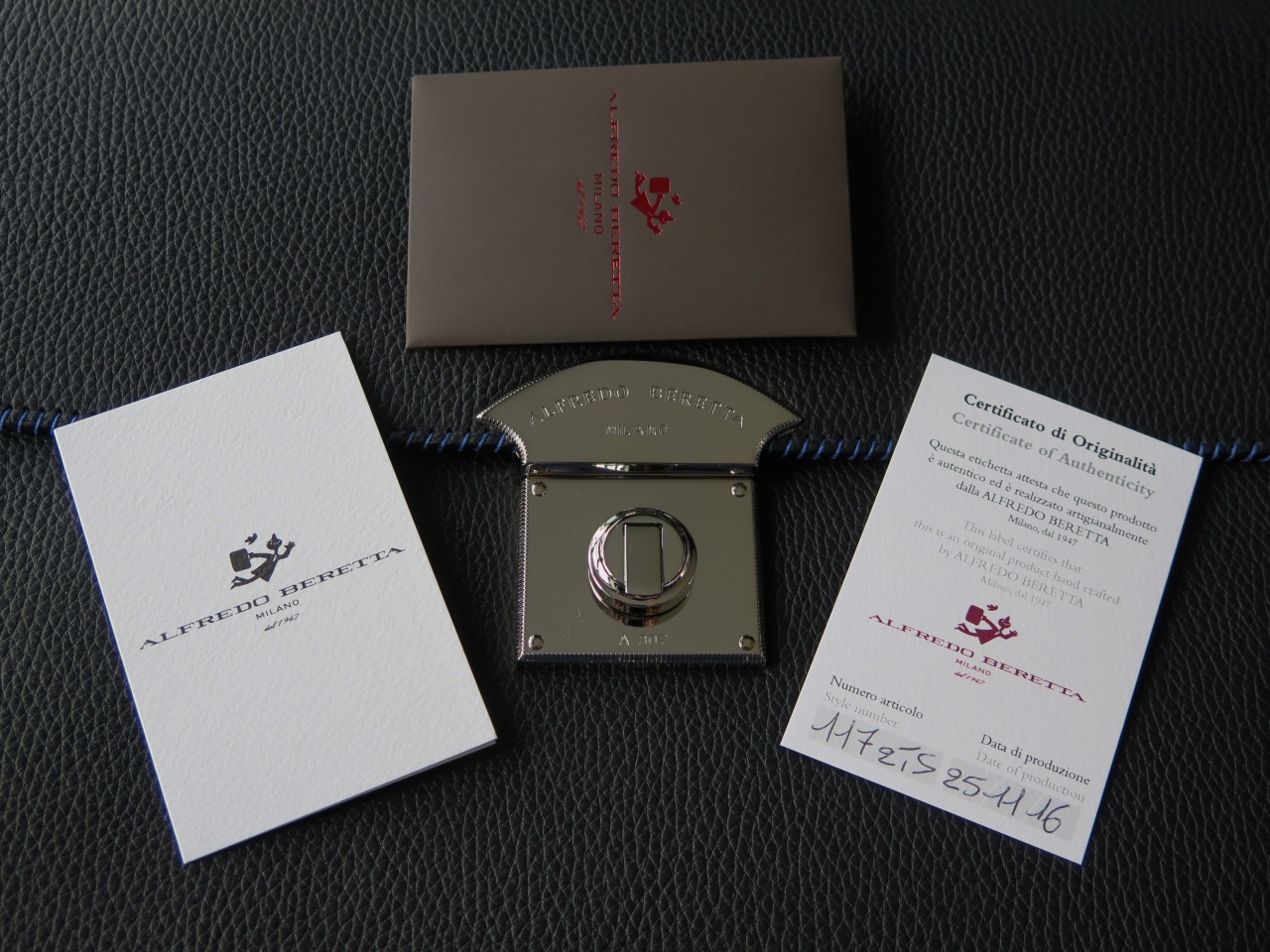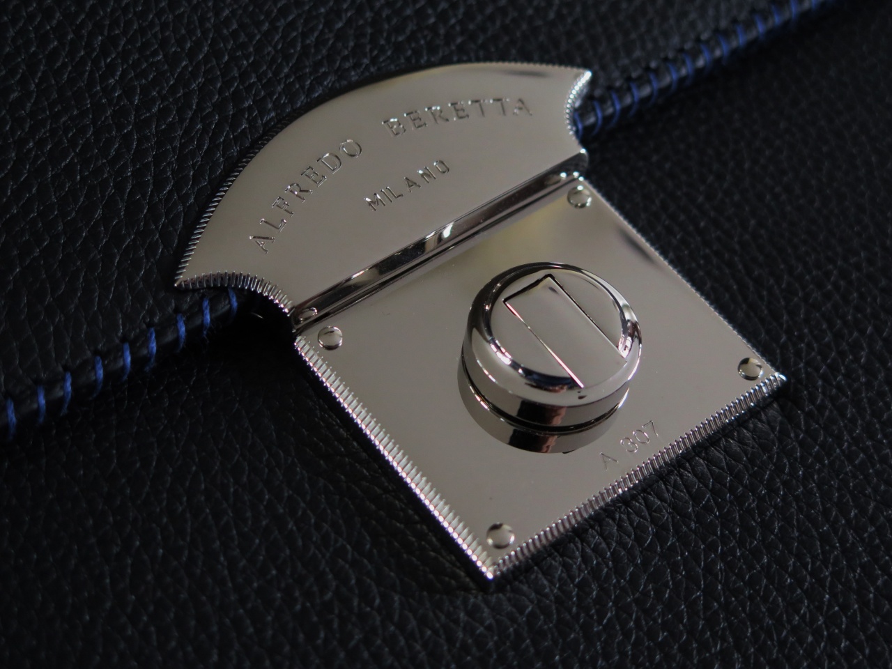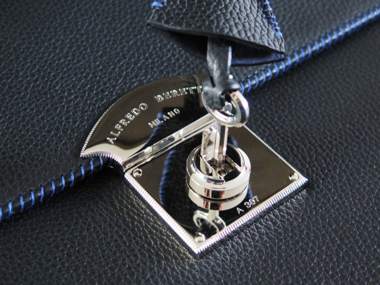 Портфель имеет декоративную прошивку нитью синего цвета. Портфель застёгивается на фирменный замок с логотипом «Alfredo Beretta Milano» и индивидуальным номером, запирающийся на ключ.