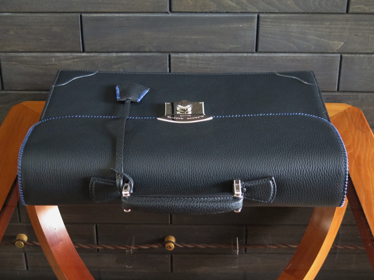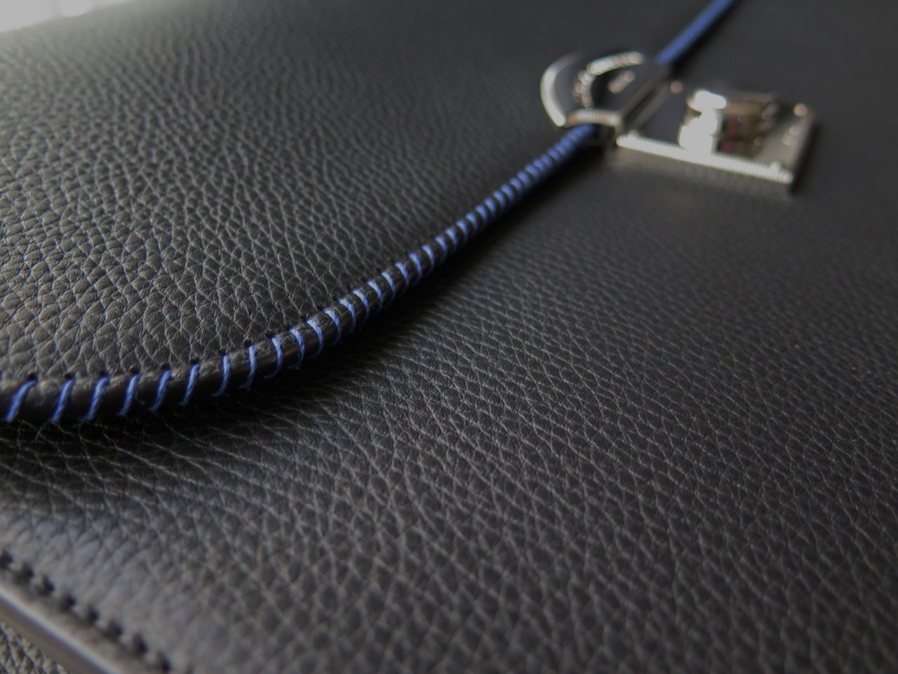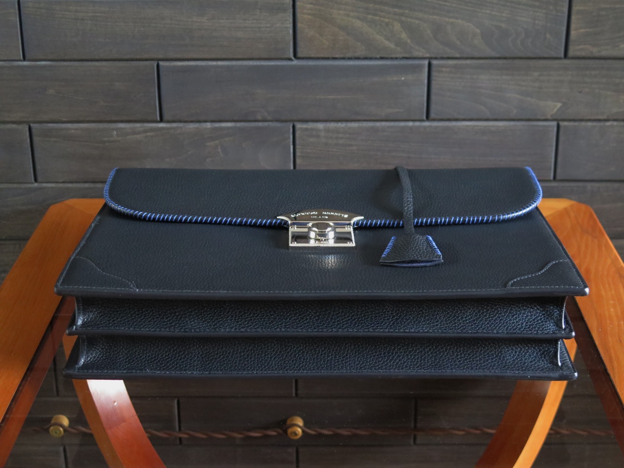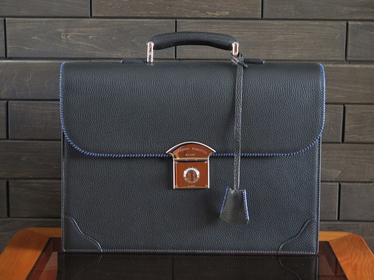 Портфель имеет декоративную прошивку нитью синего цвета. Портфель застёгивается на фирменный замок с логотипом «Alfredo Beretta Milano» и индивидуальным номером, запирающийся на ключ.