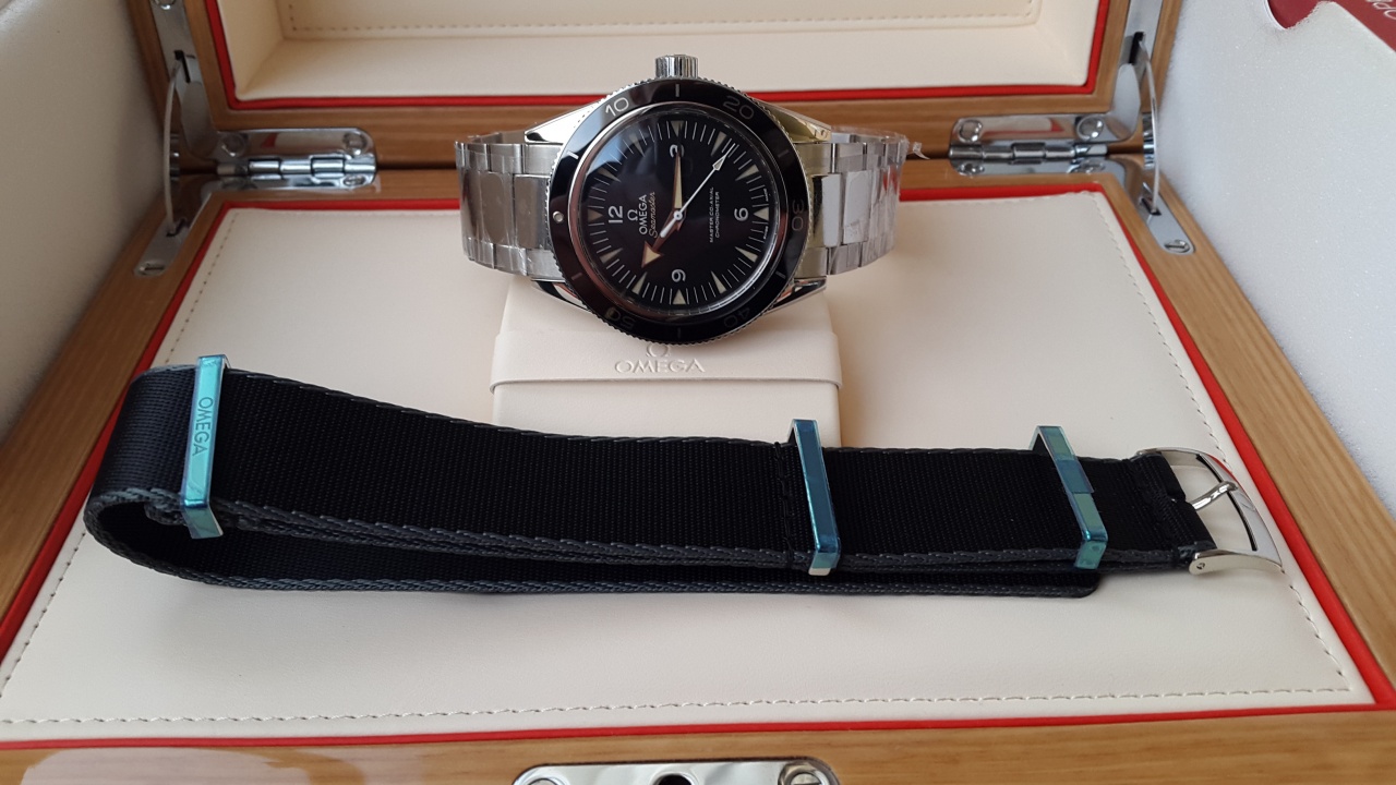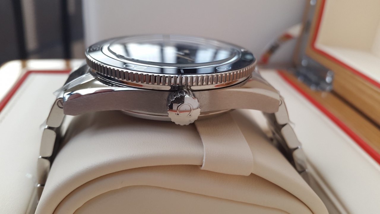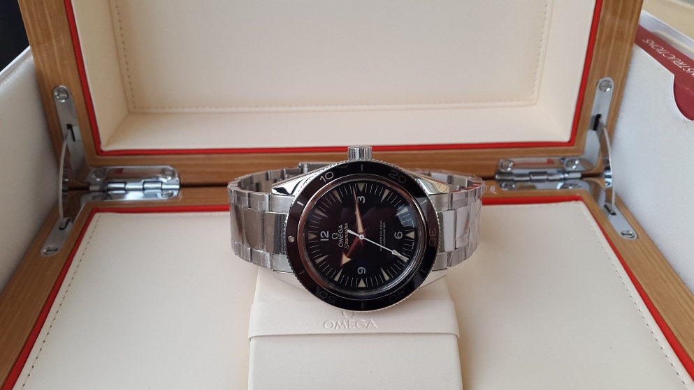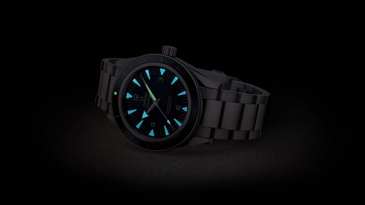 Эти часы Seamaster 300 имеют подвергнувшийся пескоструйной обработке черный циферблат с родированными стрелками, покрытыми люминофором Super-LumiNova винтажного оттенка.