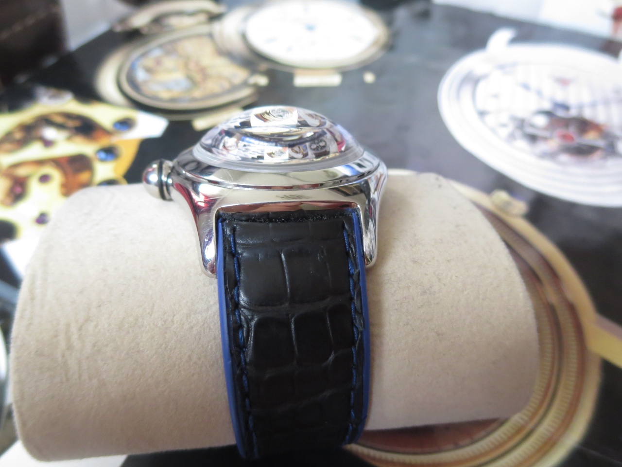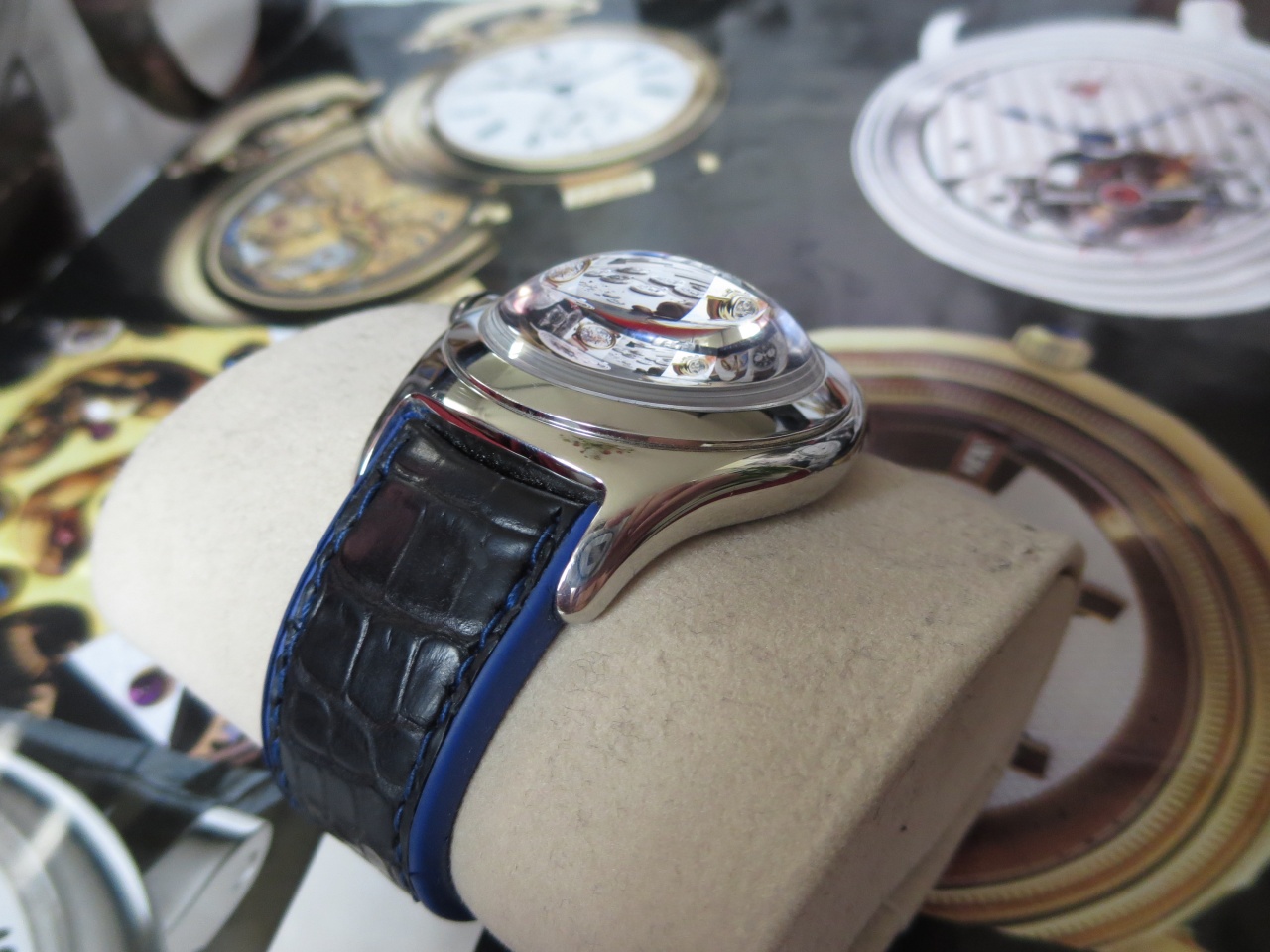 На оригинальный синий каучук, подобраны накладки из ящерицы черного цвета, все это прошито синими нитками в цвет циферблата. И как венец заменена клипса, но черную. Как итог получился просто шедевральнрый и самый стильный из мышат.