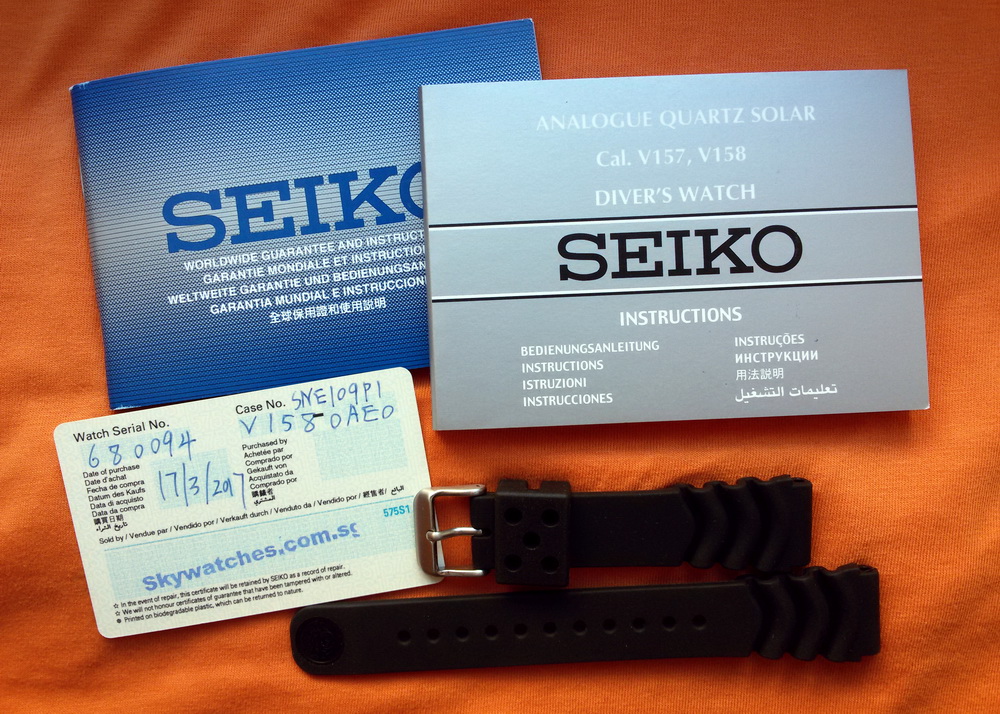 В комплекте документы и фирменный дайверский ремешок. Родной коробки не было изначально, из Японии часы получены в пакете внутри посылки.