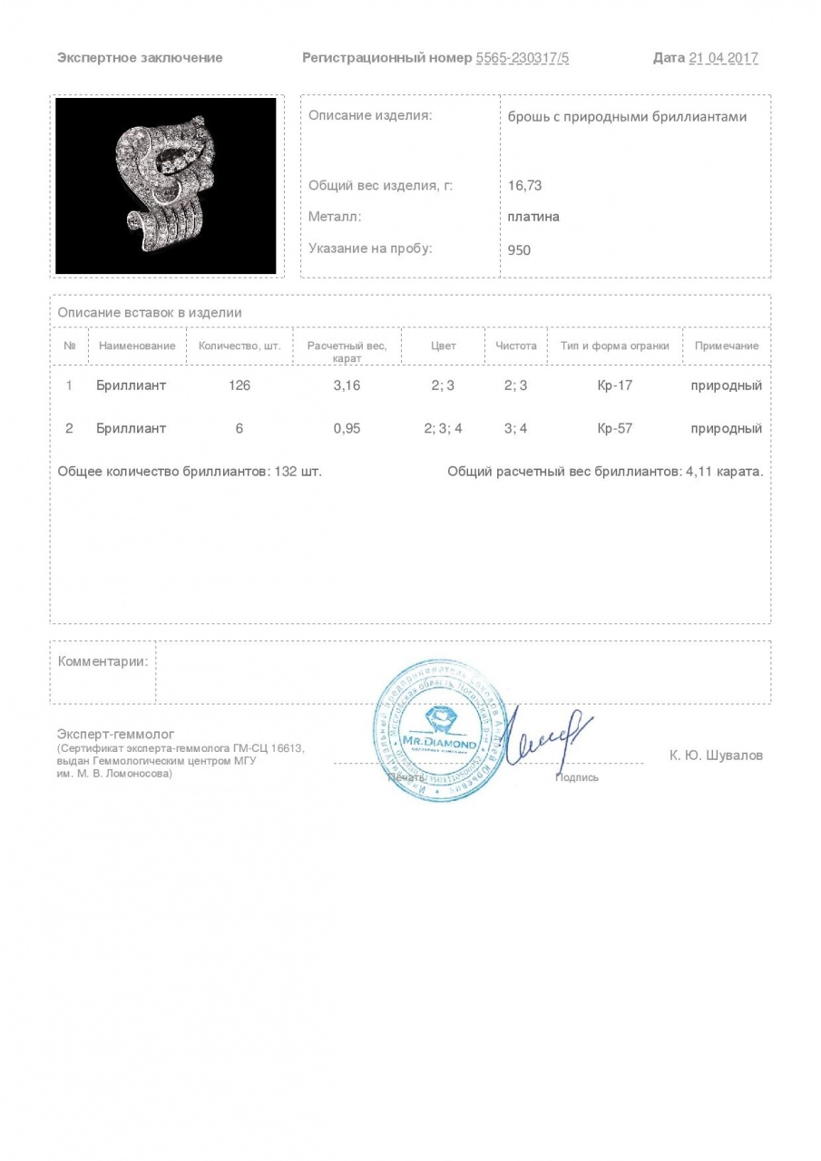 | брошь с бриллиантами 4.11ct, платиновая брошь |