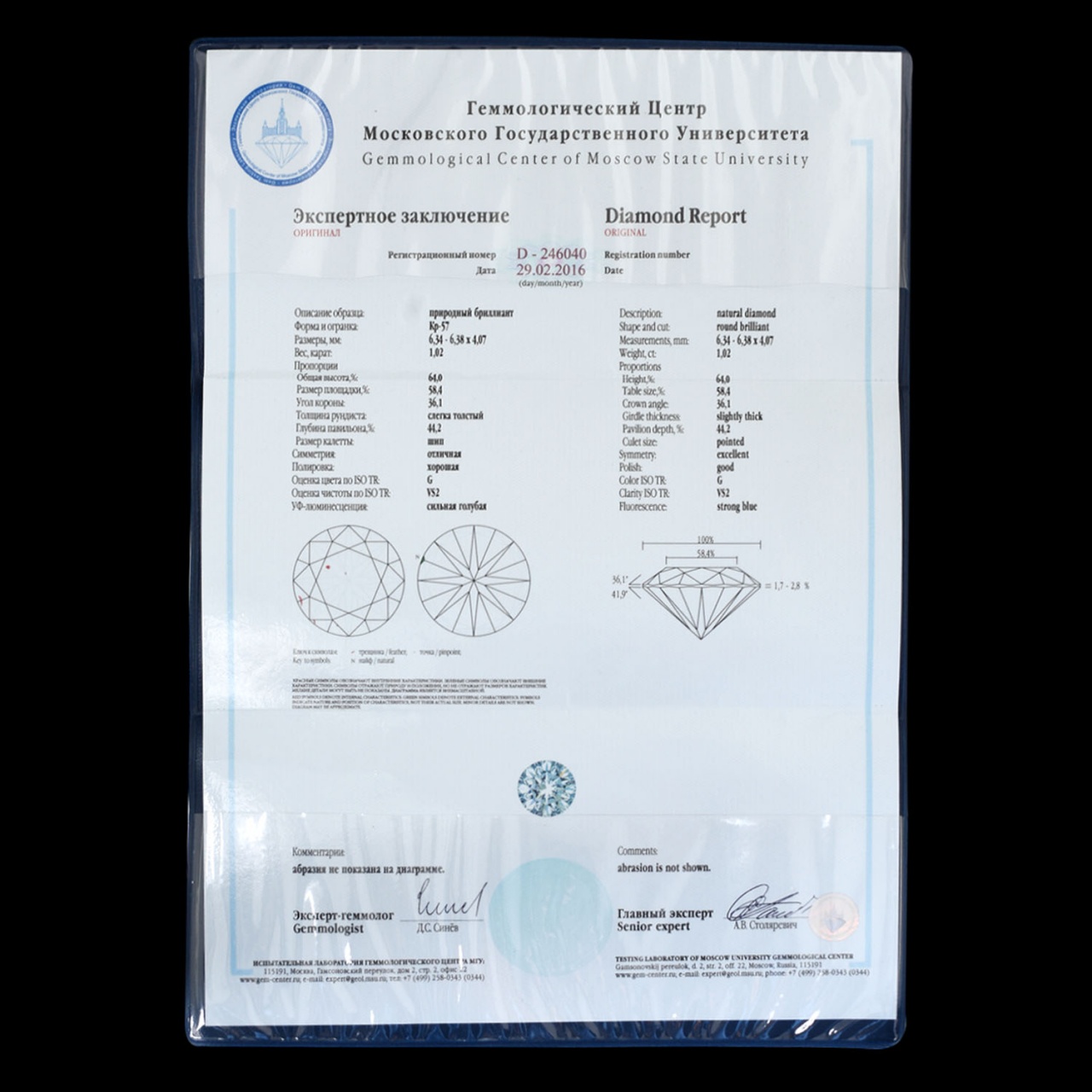 Кольцо с бриллиантом 1,02 карата. Сертификат МГУ