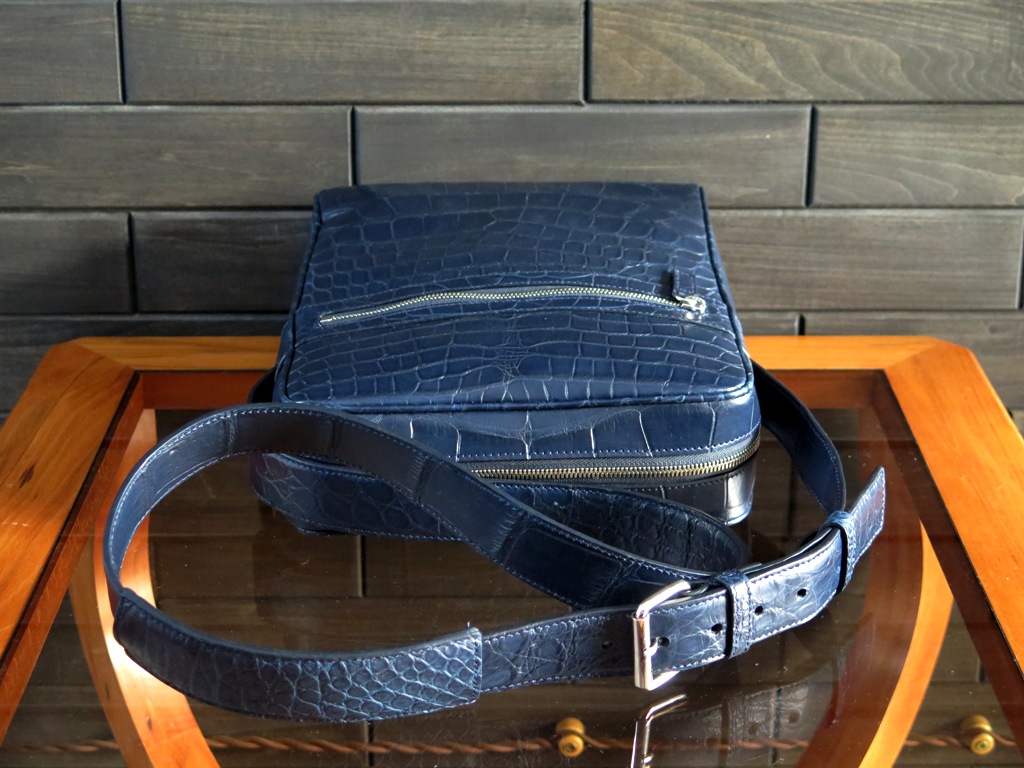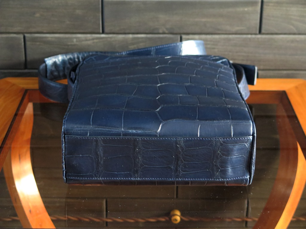 Изготовлена из 100% кожи с живота миссисипского аллигатора высочайшего качества выделки с матовой поверхностью, окрашенной вручную в тёмно-синий цвет.
