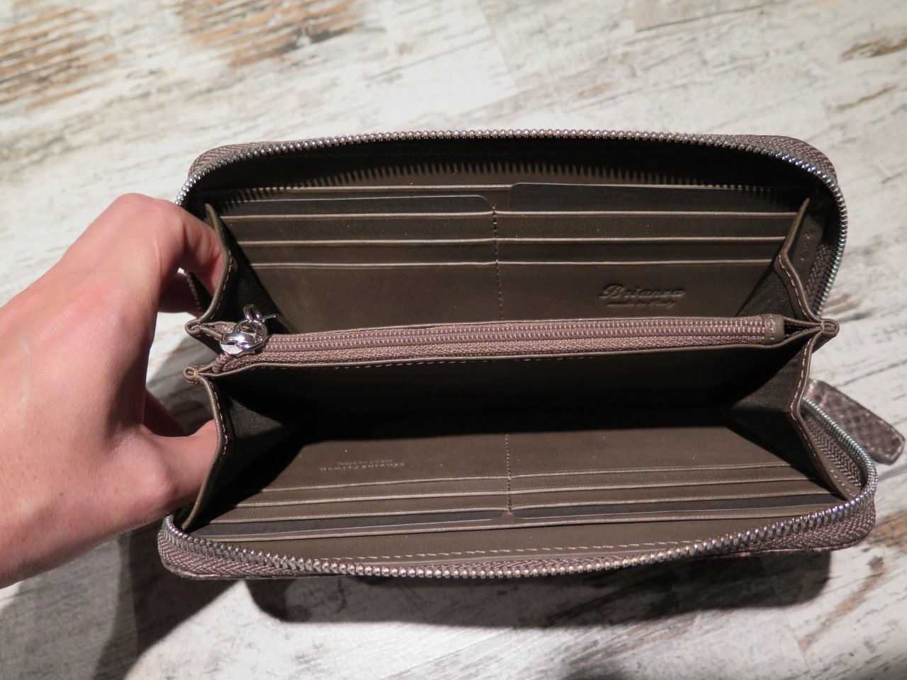 Клатч застёгивается на молнию, покрытую палладием, с бегунком из кожи анаконды. Внутри клатч отделен телячьей кожей цвета "молочный шоколад" с золотыми блестками и имеет два больших отделения для банкнот (евро, доллары, рубли), 12 отделений для кредитных карт или визиток, два отделения для паспорта, водительских прав и других документов, и центральное отделение для монет, застёгивающееся на молнию с металлическим бегунком, покрытым палладием.