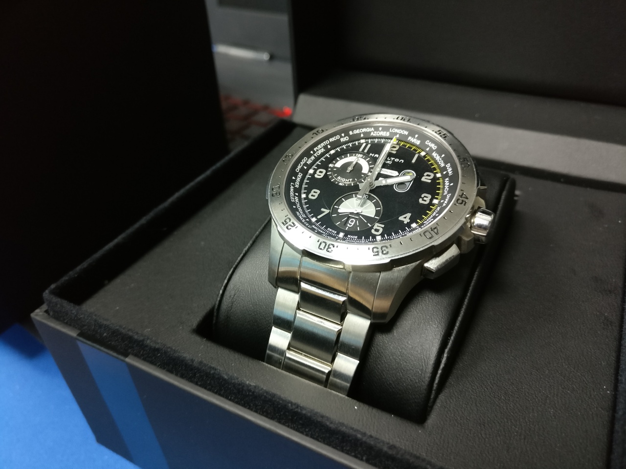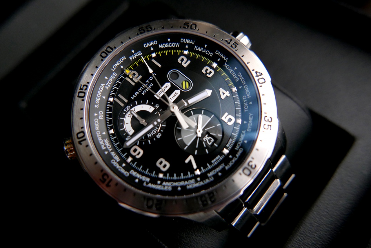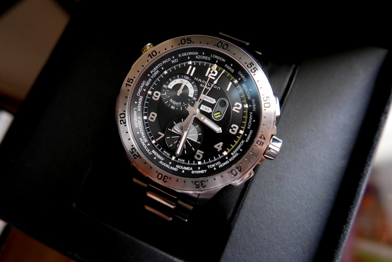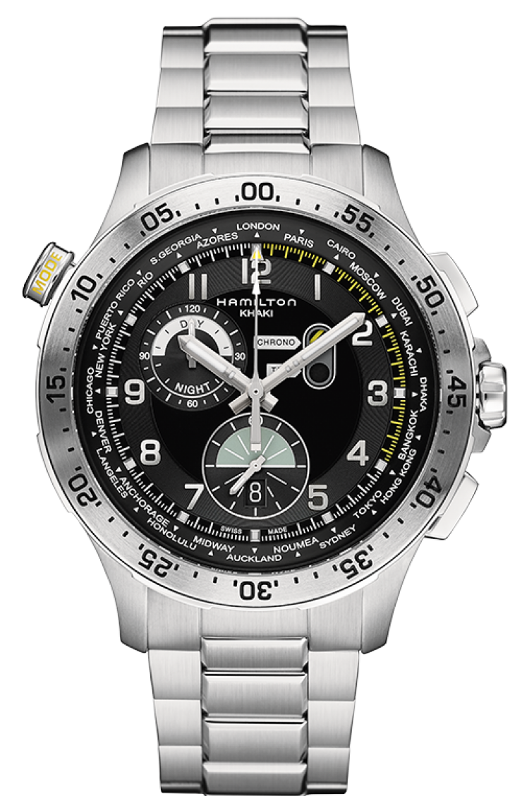 Эта модель, показанная во время базельской выставки, оснащена сложным механизмом H-41e, созданным инженерами ETA специально для Hamilton. Главная особенность калибра состоит в том, что в нем совмещены функции хронографа и ворлдтаймера. Переключение между ними происходит при нажатии кнопки на «10 часах», а индикатор на «2 часах» показывает какая из функций используется в настоящий момент. Механизм обладает рядом других уникальных характеристик. Центральная стрелка хронографа, к примеру, отвечает за измерения коротких минутных отрезков, а не показывает число прошедших секунд. Это было сделано по заказу мастера высшего пилотажа Николя Иванова, участвовавшего в создании часов. Летчику, чьи аэробатические представления длятся четыре минуты, захотелось чтобы минутный счетчик был максимально удобен для считывания показаний. По его же просьбе первые четыре минуты на соответствующей шкале размечены желтым цветом.