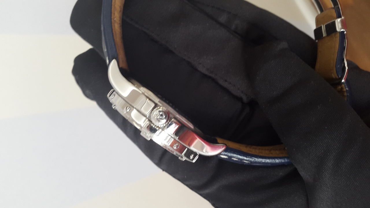 Синий оригинальный ремень из кожи аллигатора с фирменной застежкой типа бабочка.