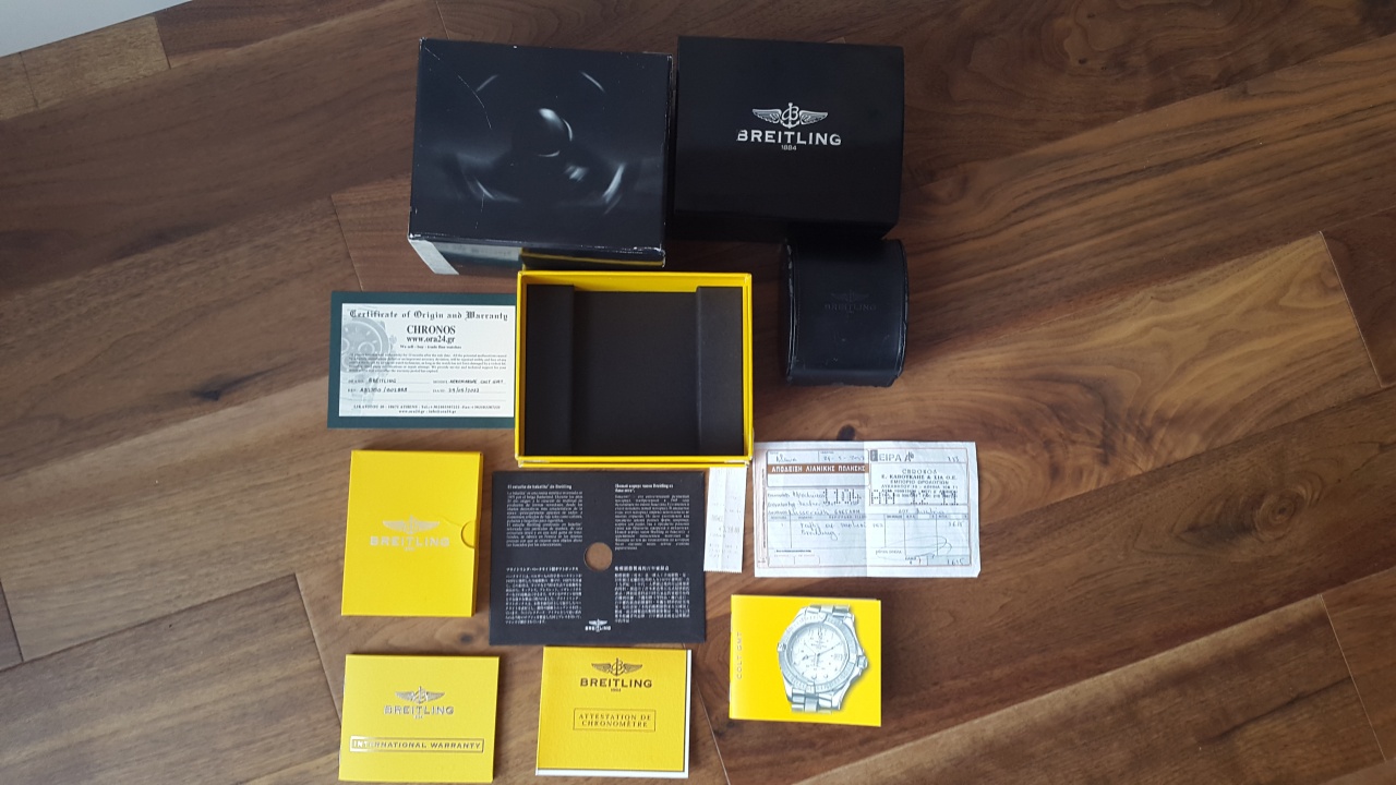 Полный комплект: коробки, инструкция, сертификат хронометра, гарантийная книжка, чеки и тд. Коробка в удволетворительном состоянии, потрепала собака(фото собаки по запросу)