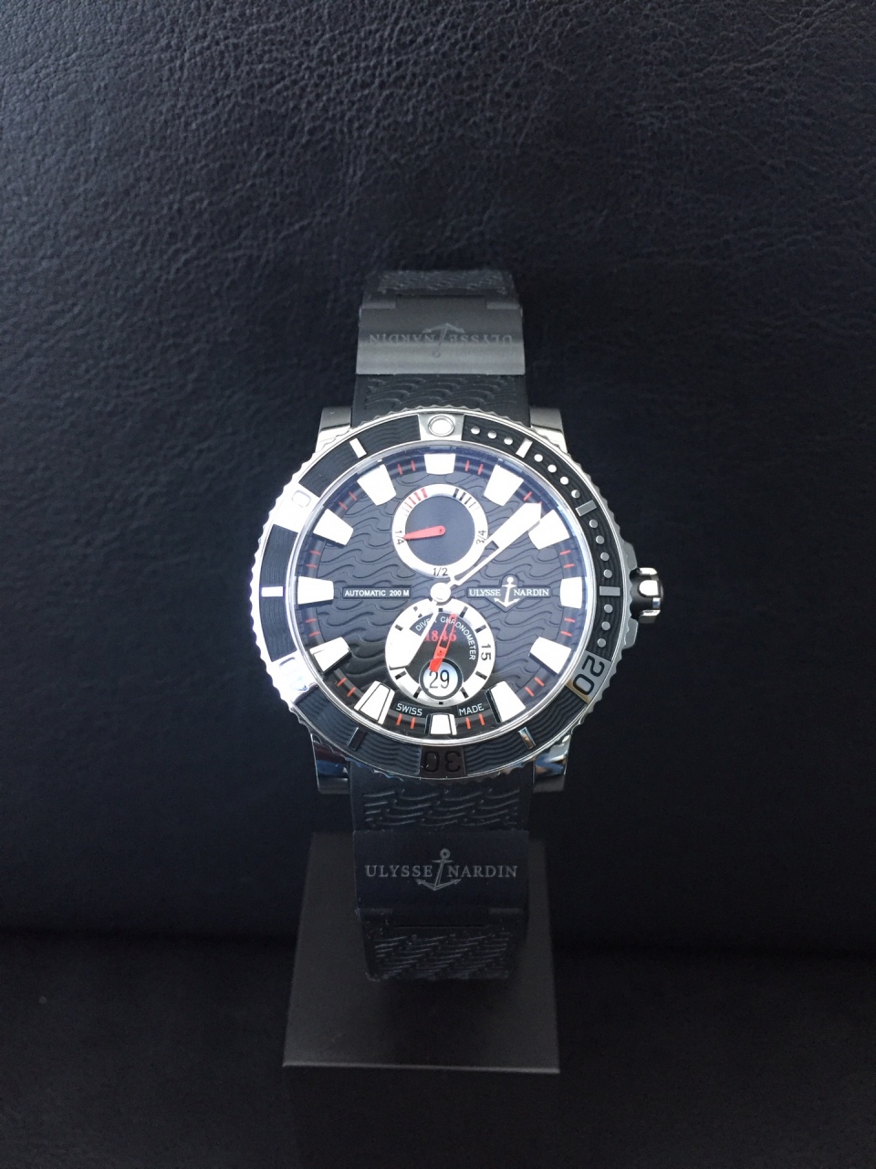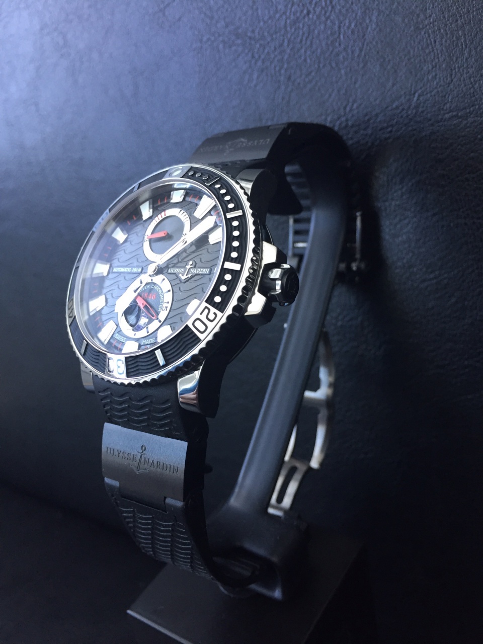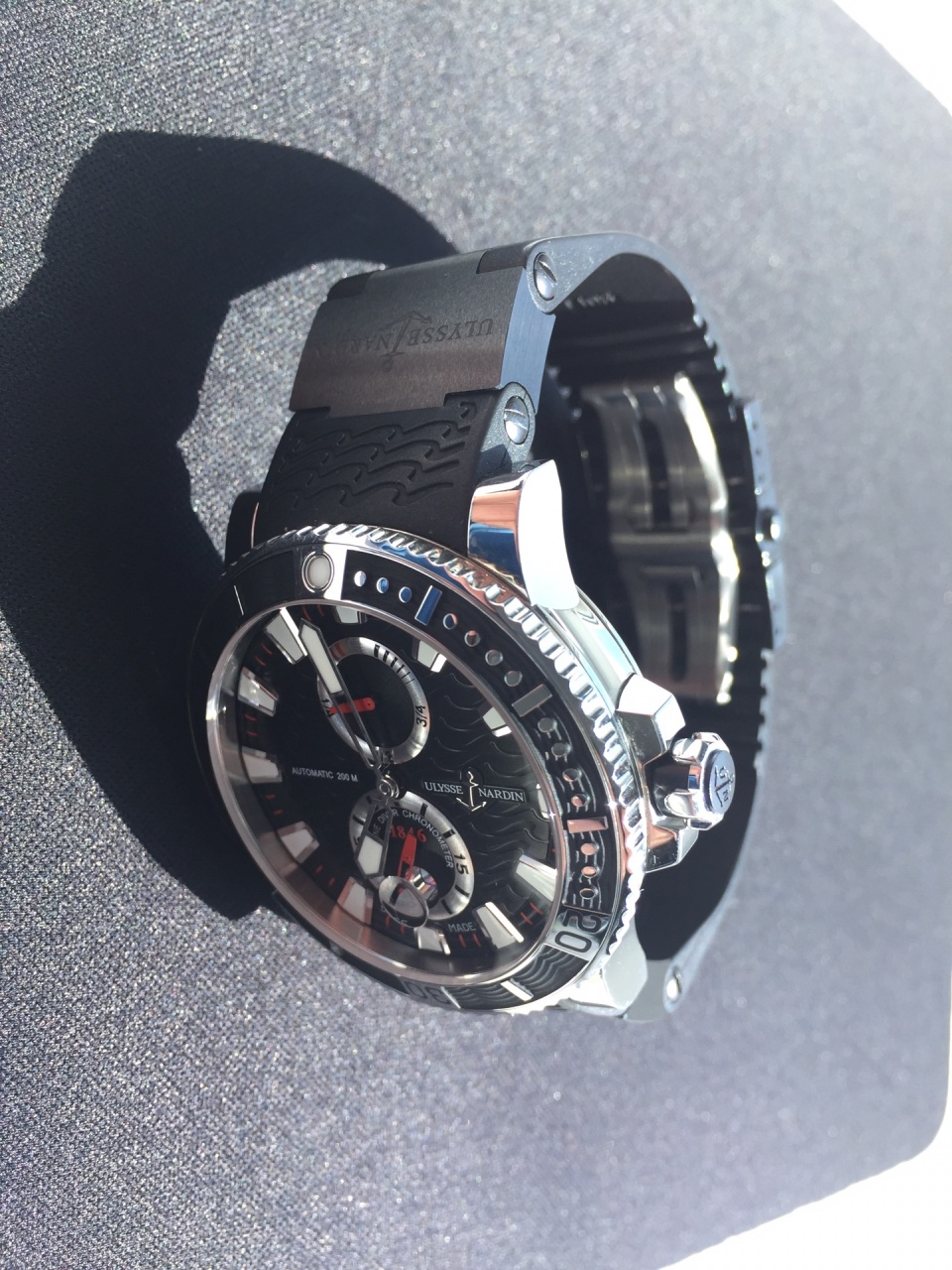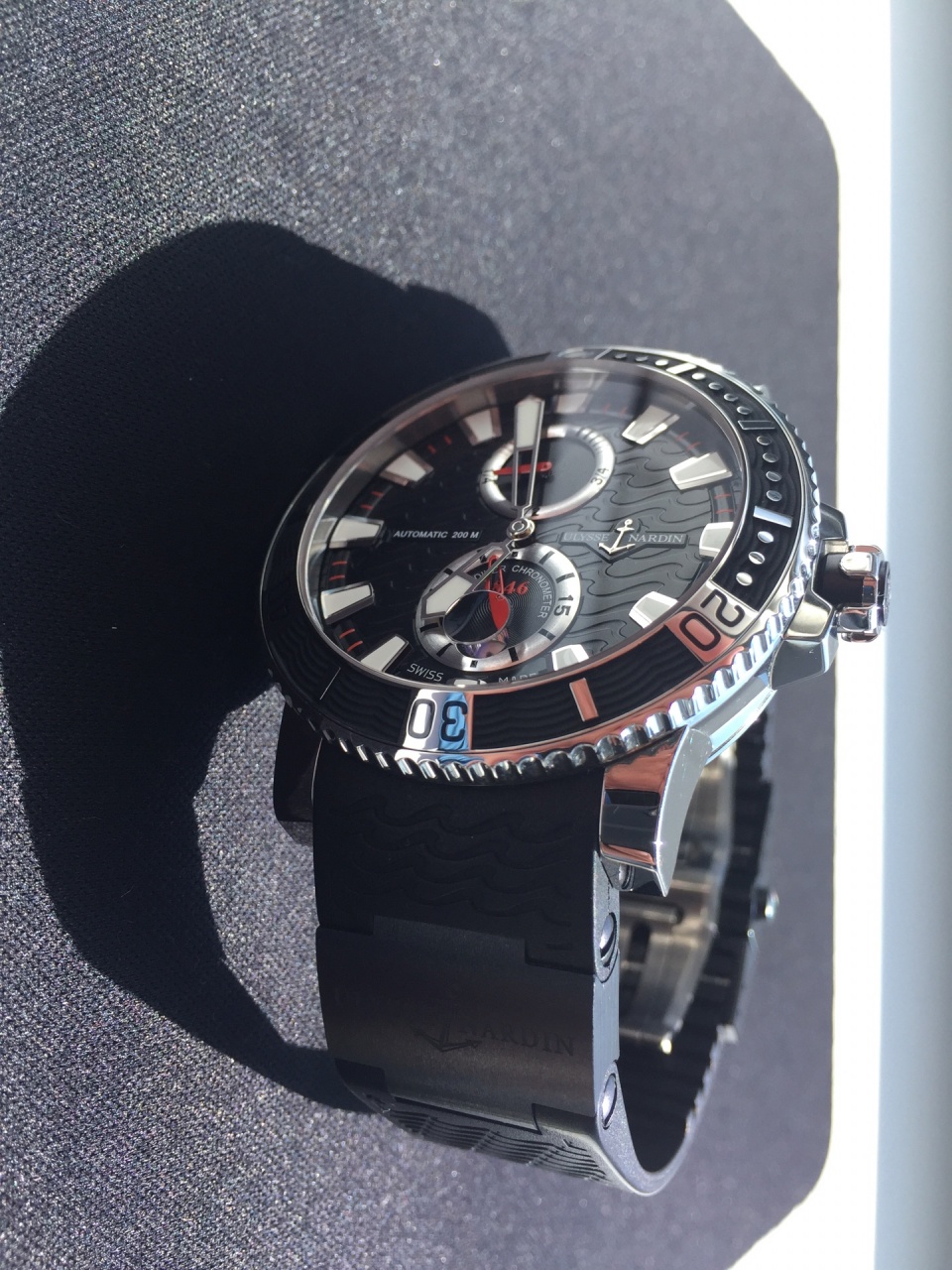 Механизм с автоматическим заводом, калибр UN-26, имеет запас хода в 42 часа, частоту колебаний баланса 28 800 пк/час и 28 камней. • Часы имеют индикатор запаса хода на «12 часах». • Центральные часовая и минутная стрелки, маленькая секундная на «6 часах». • Точность хода механизм была заверена сертификатом Швейцарского института хронометрии (C.O.S.C.) • Корпус выполнен из титанового сплава, его диаметр 45 мм, а высота 14,6 мм. • Безель из нержавеющей стали с каучуковым покрытием верхней плоскости. • Рельефный циферблат черного цвета с накладными индексами. Люминесцентное покрытие стрелок и на разметке циферблата. • Сапфировое стекло с антибликовым покрытием и лупой над апертурой даты. • Задняя крышка из титана на 6 винтах с окном из сапфирового стекла. • Заводная головка с винтовой фиксацией. • Водостойкость 200 метров (20 атм). • Каучуковый ремешок с керамическими вставками и браслетной застежкой, раскладывающейся одним касанием.