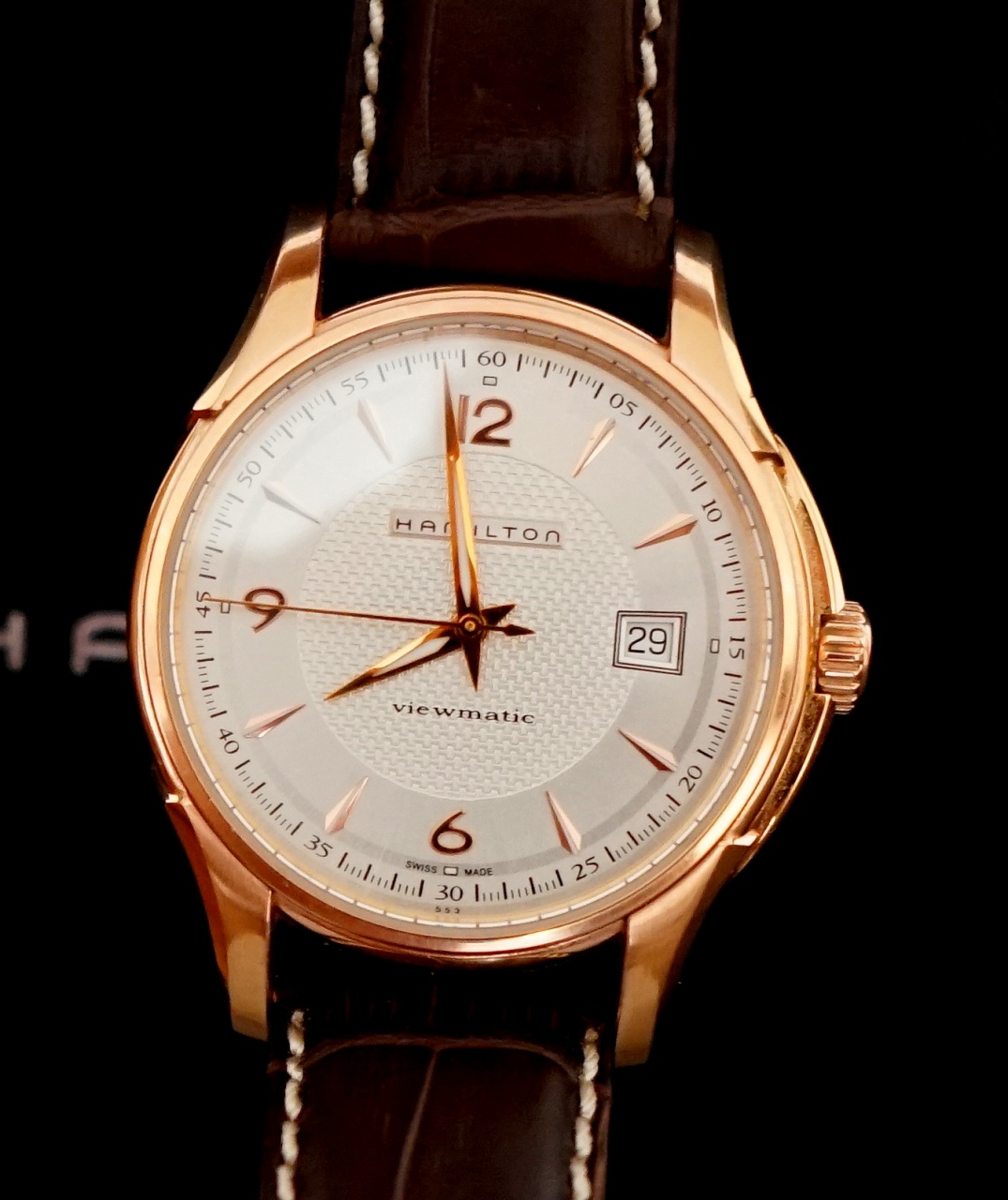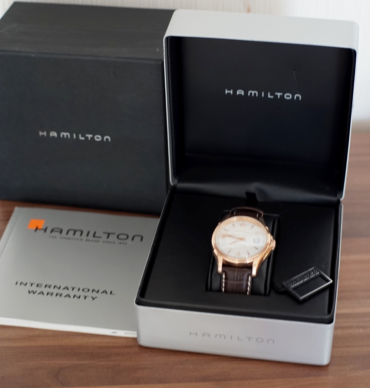 Предлагаю отличные костюмники от Хамильтон - механика с автоподзаводом, запас хода 42 часа, состояние идеальное, ремень вообще неношенный, царапин нет, ход точный. Все коробки, книжки на месте. Стекло сапфир с двух сторон. Корпус - PVD розовое золото. Функции: Часы, минуты, центральная секундная стрелка, дата. Светящиеся метки и стрелки. Водонепроницаемость 50м.