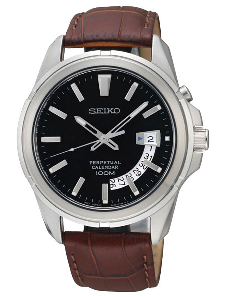 Японский кварцевый механизм SEIKO, калибр Perpetual Calendar 6A32. Технология вечного календаря автоматически учитывает количество дней в месяцах, високосный цикл и не нуждается дополнительно в ежемесячной коррекции даты, вплоть до 2100 года. • Точность хода +/-20 сек в месяц. • Элемент питания SR927SW(SB-AP) со сроком службы до 4 лет. • Центральные часовая, минутная и секундная стрелки. • Отображение даты в увеличенной полукруглой апертуре. • При выполнении соответствующей комбинации заводной головки и кнопки – вывод при помощи стрелок месяца и года в високосном цикле. • Система индикации низкого заряда батареи. • Диаметр корпуса 40 мм. • Сапфировое стекло устойчивое к царапанию. • Корпус из высококачественного стального сплава 316L с высокими антикоррозийными свойствами. • Ремешок из натуральной кожи коричневого цвета. • Водозащита до 10 АТМ. • Светонакопительный состав на стрелках и маркерах часа. • Циферблат черный.