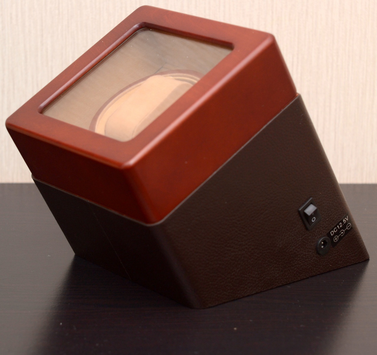 В продаже виндер. Отделка экокожей, верхняя часть из дерева. Стационарный, работает от сети. Адаптер в комплекте. Схема работы: поочередно 2 мин по часовой, 2 мин против часовой в течении 38 минут с повтором через каждые 2 часа. Вес с упаковкой 1,9 кг.