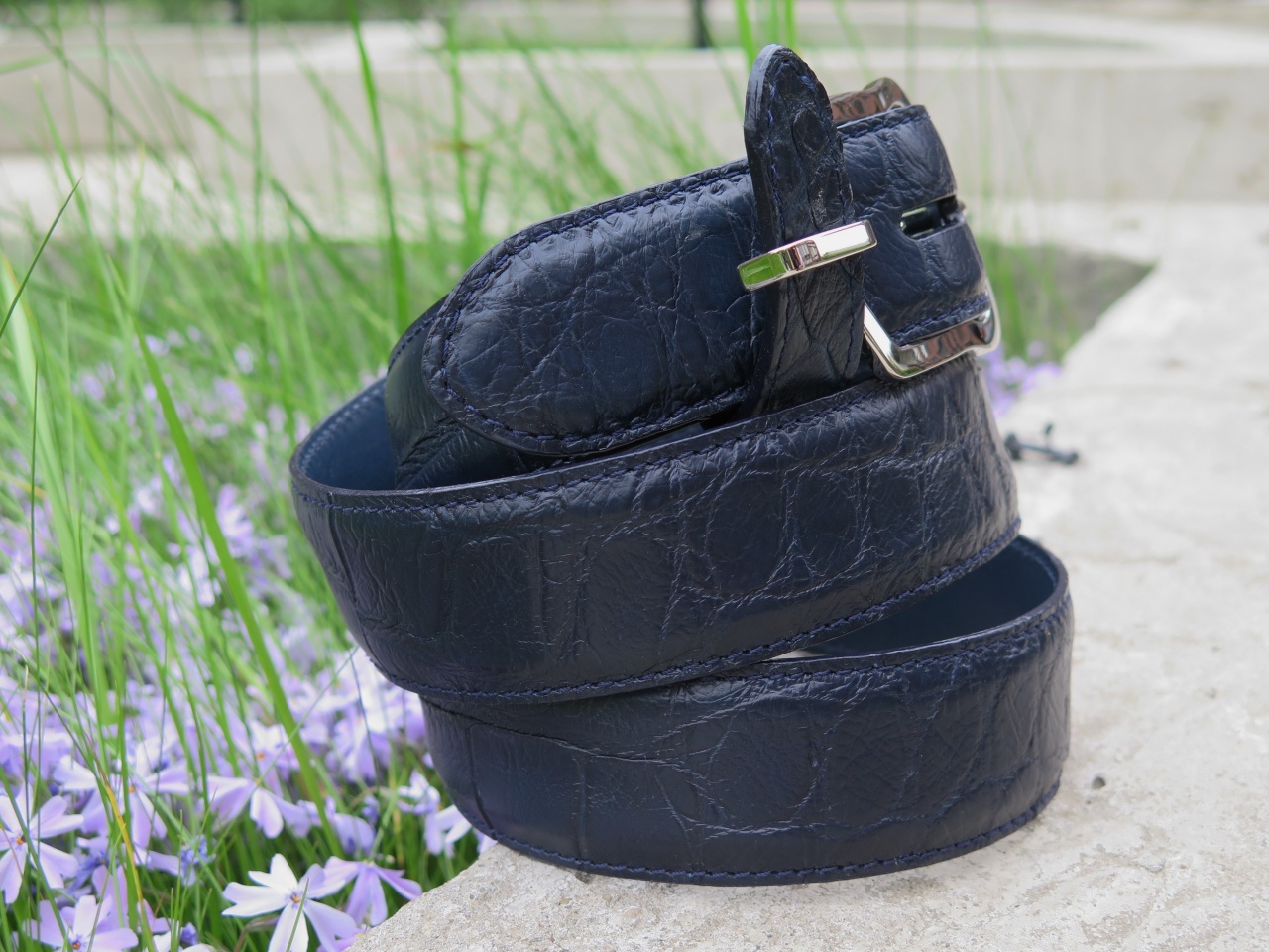Синий мужской ремень ручной работы Brianza, изготовлен из 100% кожи миссисипского аллигатора высочайшего качества выделки.