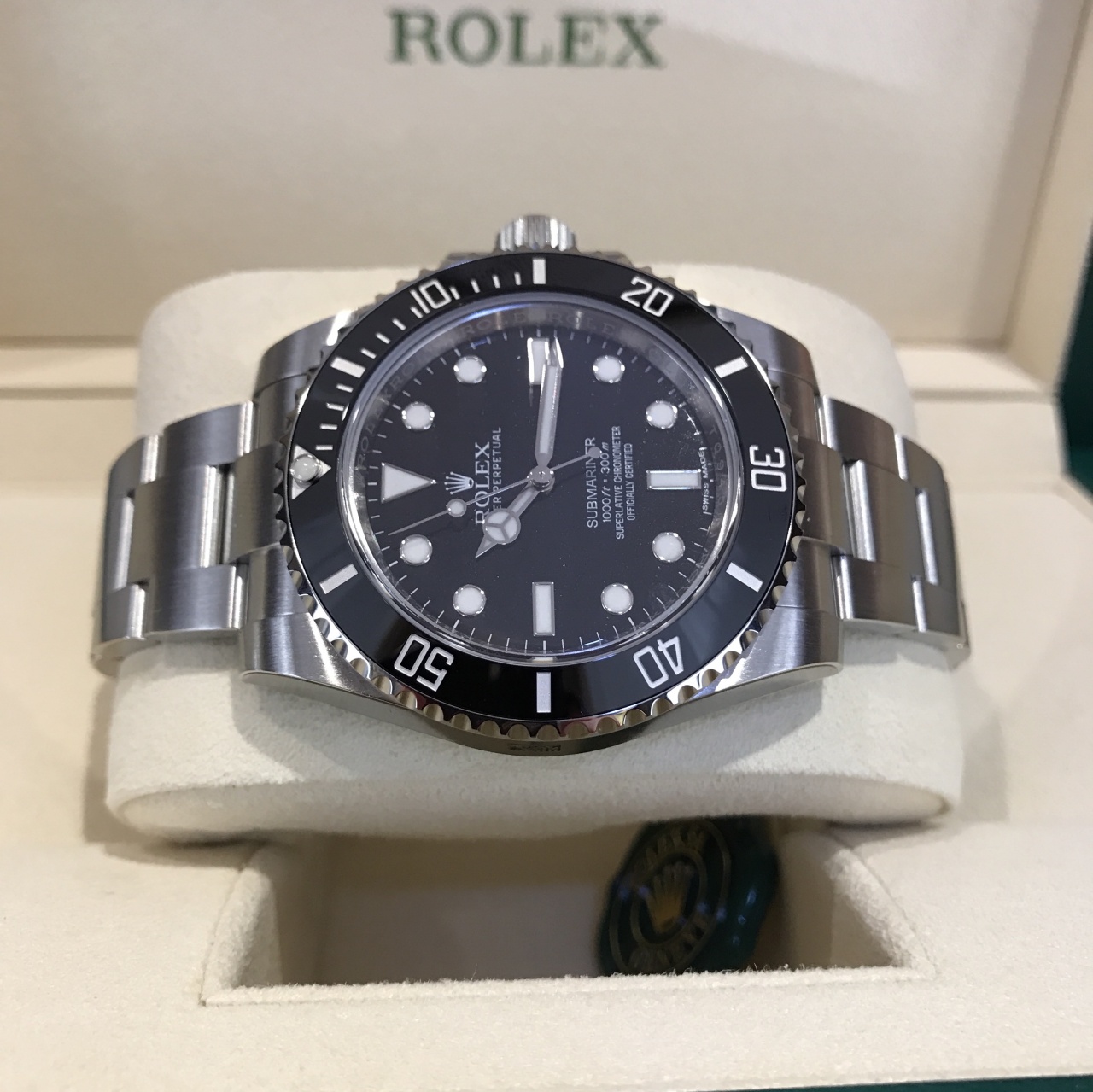 Rolex, Submariner, сталь 904L, 40мм, вращающийся в одном направлении, с 60‑минутной градуированной шкалой, устойчивый к появлению царапин керамический диск Cerachrom с цифрами и делениями, покрытыми платиной, заводная головка привинчиваемая, с системой тройной герметизации Triplock, стекло сапфировое, устойчивое к появлению царапин, водонепроницаемость 300м, механизм Perpetual, автоматический подзавод, калибр 3130, мануфактурного производства Rolex, точность хода -2/+2 сек/сутки (после установки механизма в корпус), автоматический подзавод в двух направлениях с помощью ротора Perpetual, запас хода около 48 часов