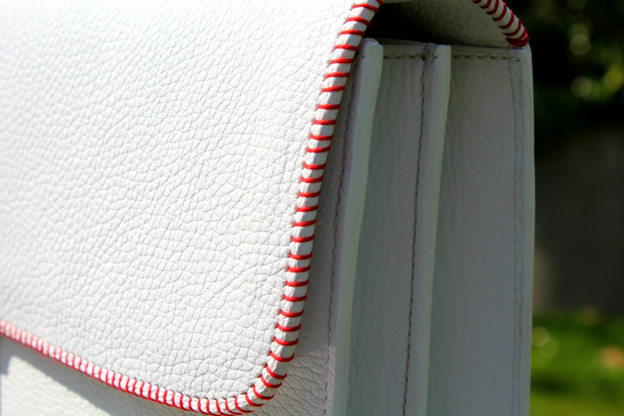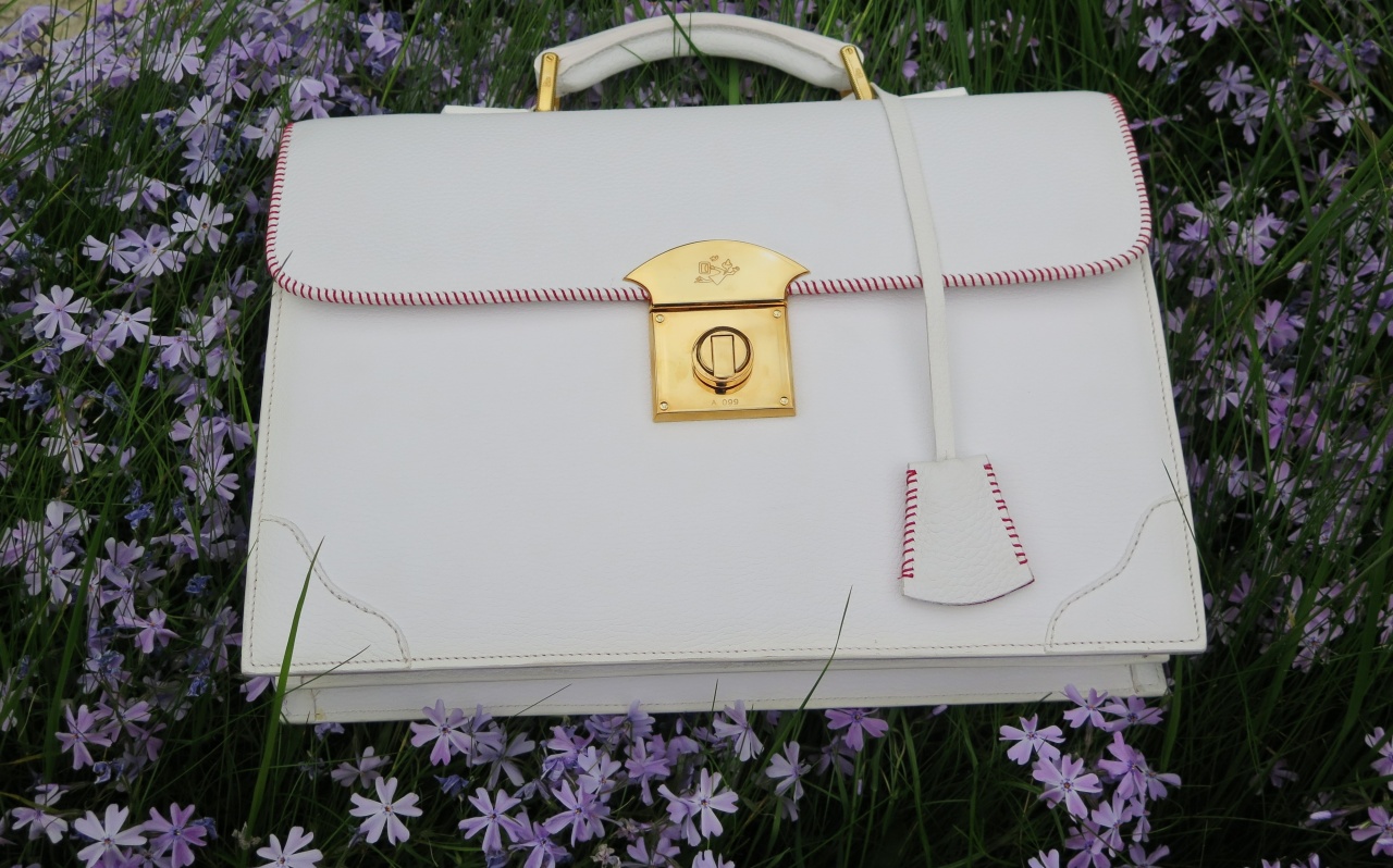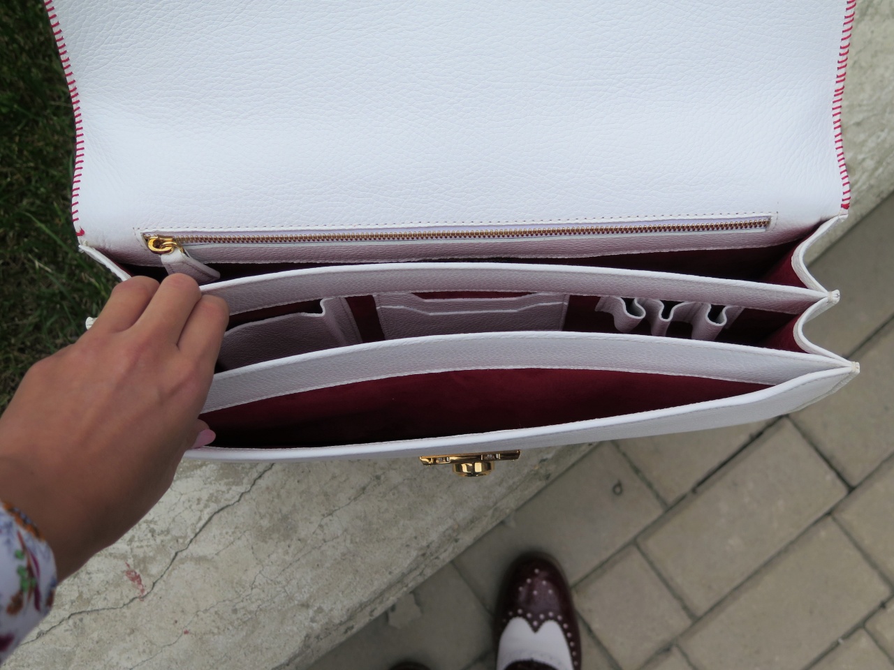 Портфель имеет декоративную прошивку нитью красного цвета, выполненную вручную, что особенно эффектно смотрится на белом фоне портфеля.
