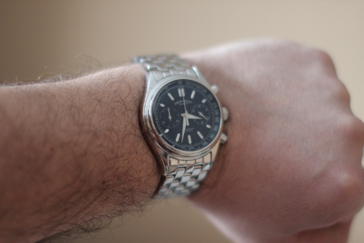 Очень красивые часы. Механика с автоподзаводом. Хронограф. На полном комплекте. Состояние идеальное. Естественные следы носки как у всех. Ход отличный. Не полировались. Диаметр корпуса 43 мм. Высота корпуса 14 мм. Гильошированный циферблат чёрного цвета. Стрелки покрыты светонакопительным составом. Сапфировое стекло с антибликовым покрытием. Сапфировая задняя крышка. Винтовой фиксатор головки. Водозащитна 14 atm. Часы на браслете (покупался отдельно за фантастические деньги). Родной ремешок в комплекте (состояние между 3 и 4).