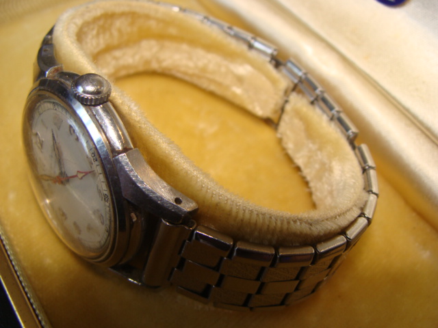 Теперь немного о часах. Приобретены в год рождения Химейера, т.е. в 1951 году. Механика, браслет резинка, оригинальное стекло, оригинальный ключ, красная секундная стрелка и самое главное автоподзавод. Бокс оригинальный, бархат - шелк. На отличном ходу, резерв ( запас) хода 28 часов.