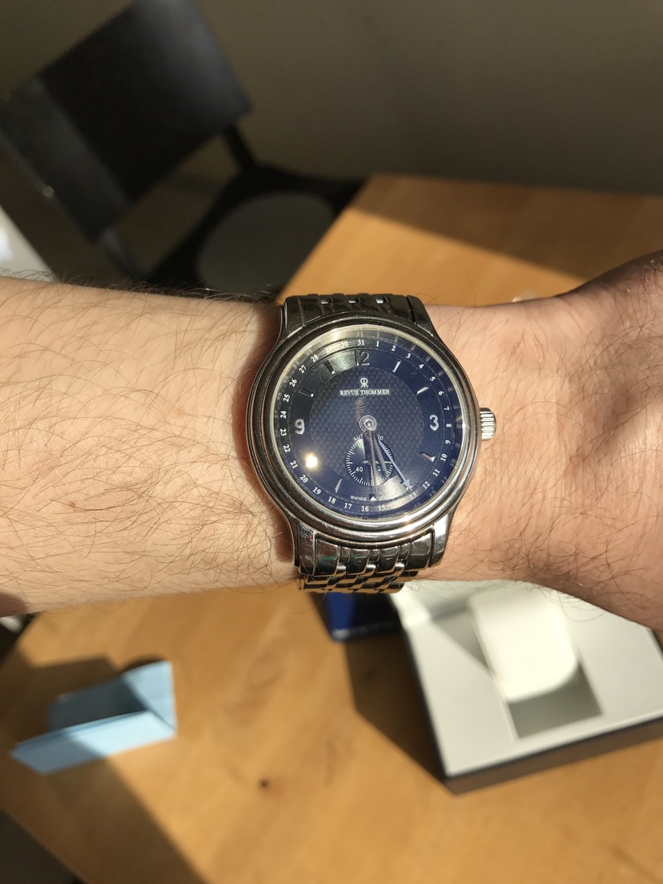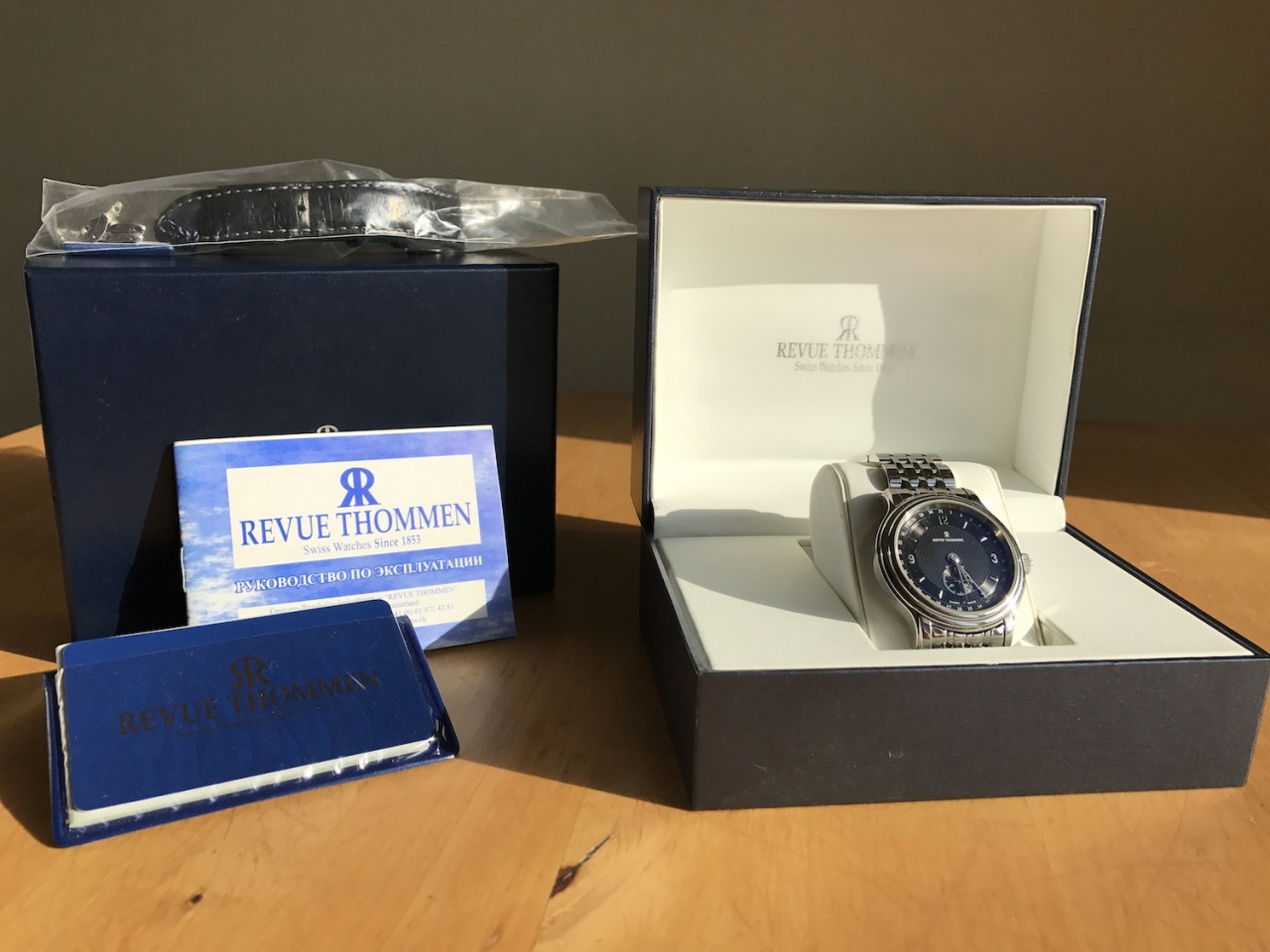 Продам часы Revue Thommen Classic Date Pointer. Черный циферблат. Диаметр циферблата 41мм. Реф.номер модели 14200.2137. Автомат. Мануфактурный механизм Revue Thommen GT56. Модель с браслетом, но докупался кожаный ремень (продаю вместе с часами). Большую часть времени с момента покупки часы лежали в столе, поэтому находятся в идеальном состоянии.