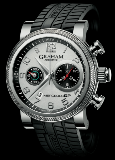 В честь своего партнерства с командой Формула 1 Mercedes GP Petronas, часовая компания GRAHAM London выпустила новую модель MERCEDES GP TRACKMASTER в двух версиях: с черным карбоновым (Ref. 2MEAS.B01A) и серебристым (Ref. 2MEAS.S01A) циферблатами.