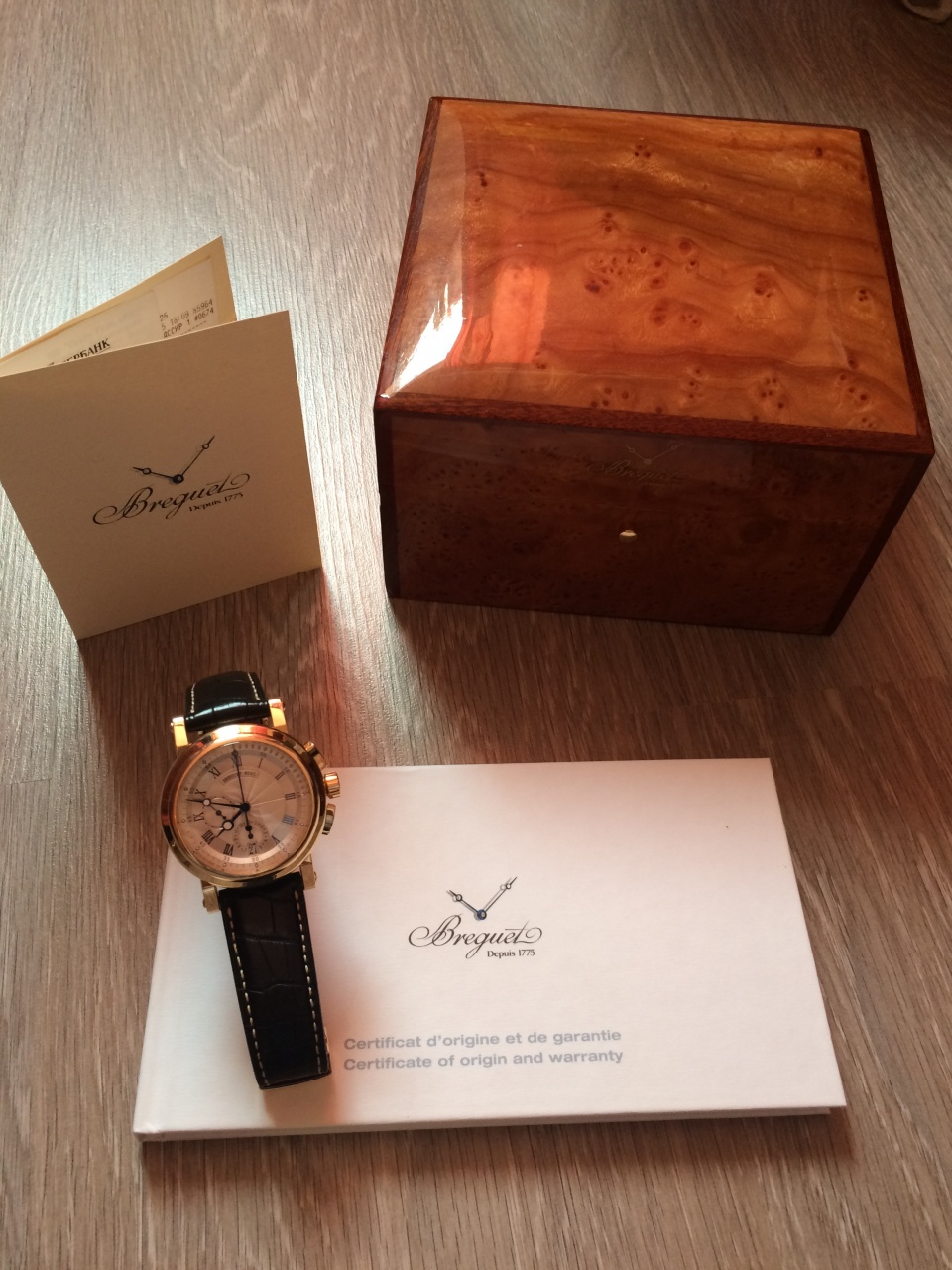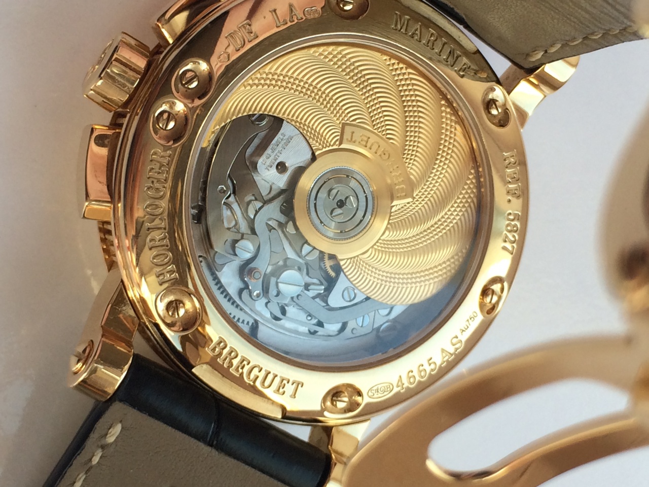 Полированный корпус Marine Automatic Chronograph выпущен из 18-каратного желтого золота. Размер корпуса составляет 42 х 14,1 мм. На серебристом гильошированном циферблате вороненые римские цифры смотрятся очень элегантно. Напротив каждой цифры на минутной шкале нанесена люминесцентная метка, такая же метка украшает «яблоки» Бреге. Светящаяся в темноте краска позволяет определять время в условиях низкой освещенности. Апертура даты находится на позиции 6 часов, дополнительный секундный циферблат - на 9-ти часах. Хронограф отсчитывает время дополнительным 12-часовым счетчиком, установленным на 6-ти часах и центральными стрелками: секундная — вороненая и минутная — серебристая стрелка с наконечником в форме ромба, покрытым люминофором. Автоматический калибр Breguet 583Q/1 имеет запас хода около 48 часов. Водонепроницаемость корпуса до 100 метров. Устойчивые к появлению царапин сапфировые стекла закрывают корпус с тыльной и лицевой стороны. Прозрачная задняя крышка дает возможность любоваться золотым ротором с узором гильоше, выполненным вручную. Часы комплектуются каучуковым ремешком с золотой застежкой.