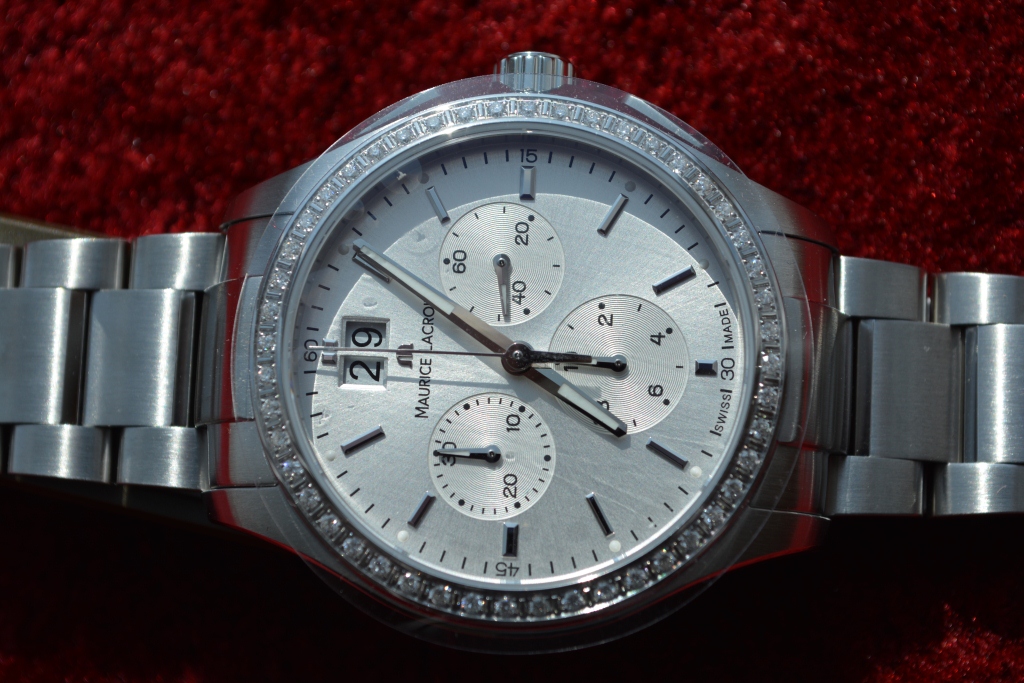 Корпус и браслет из нержавеющего стального сплава 316L. Трёхрядный браслет с раскладывающейся застёжкой-бабочкой. Неподвижный безель украшен 48 бриллиантами диаметром 1,4 мм и общим весом 0.4855 карата. Диаметр корпуса 38 мм, толщина корпуса 10 мм. Ширина браслета 17 мм, съёмные звенья. Завинчивающаяся заводная головка с логотипом. Серебристый сатинированный циферблат с накладными блестящими метками и логотипом. Большое окошко даты в положении 12 часов. Люминесцентные метки и часовая и минутная стрелки. Секундомер. 3 гильошированных циферблата хронографа: 60 секунд, 30 минут и 1/10 секунды. Устойчивое к появлению царапин сапфировое стекло с антибликовым покрытием (что хорошо видно на фото, даже несмотря на защитную плёнку).