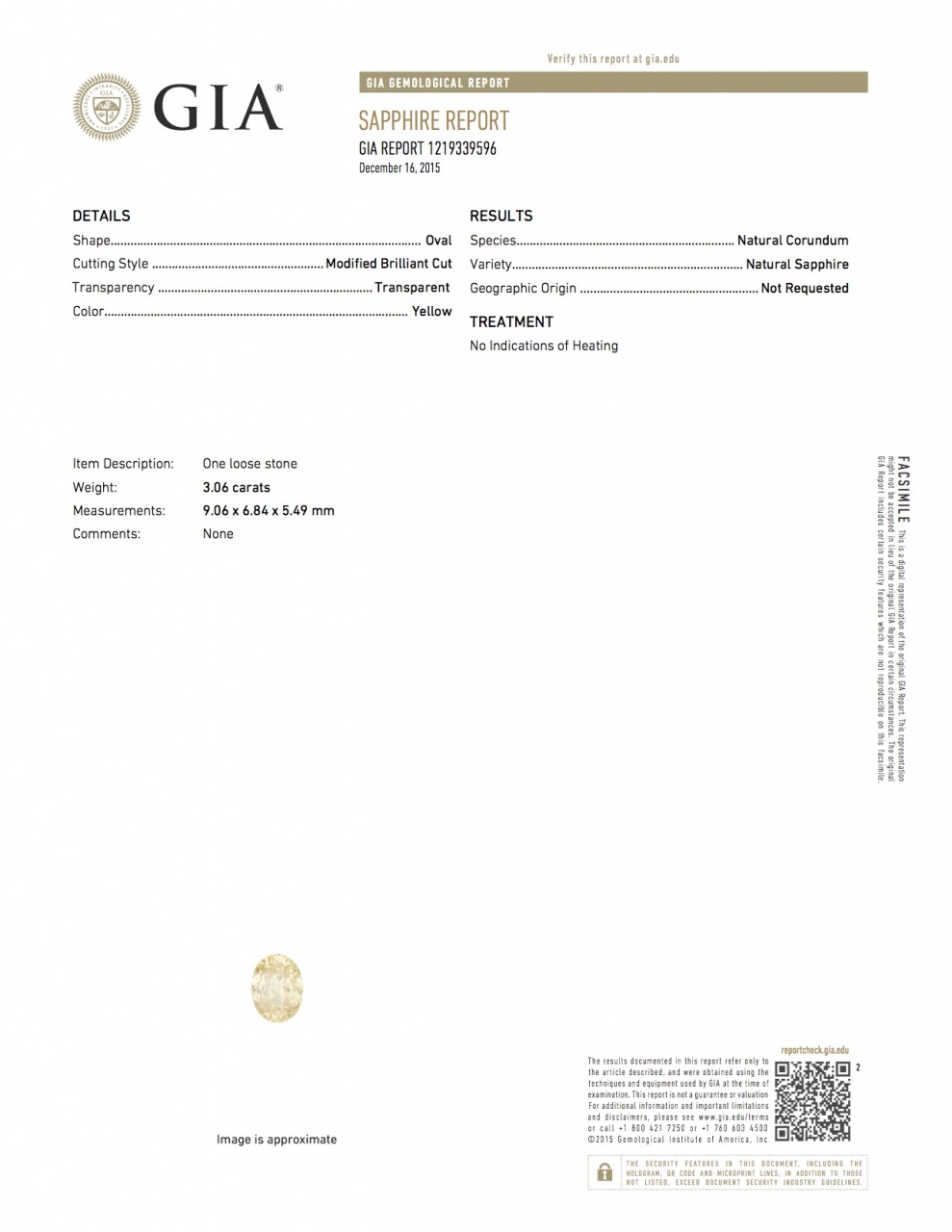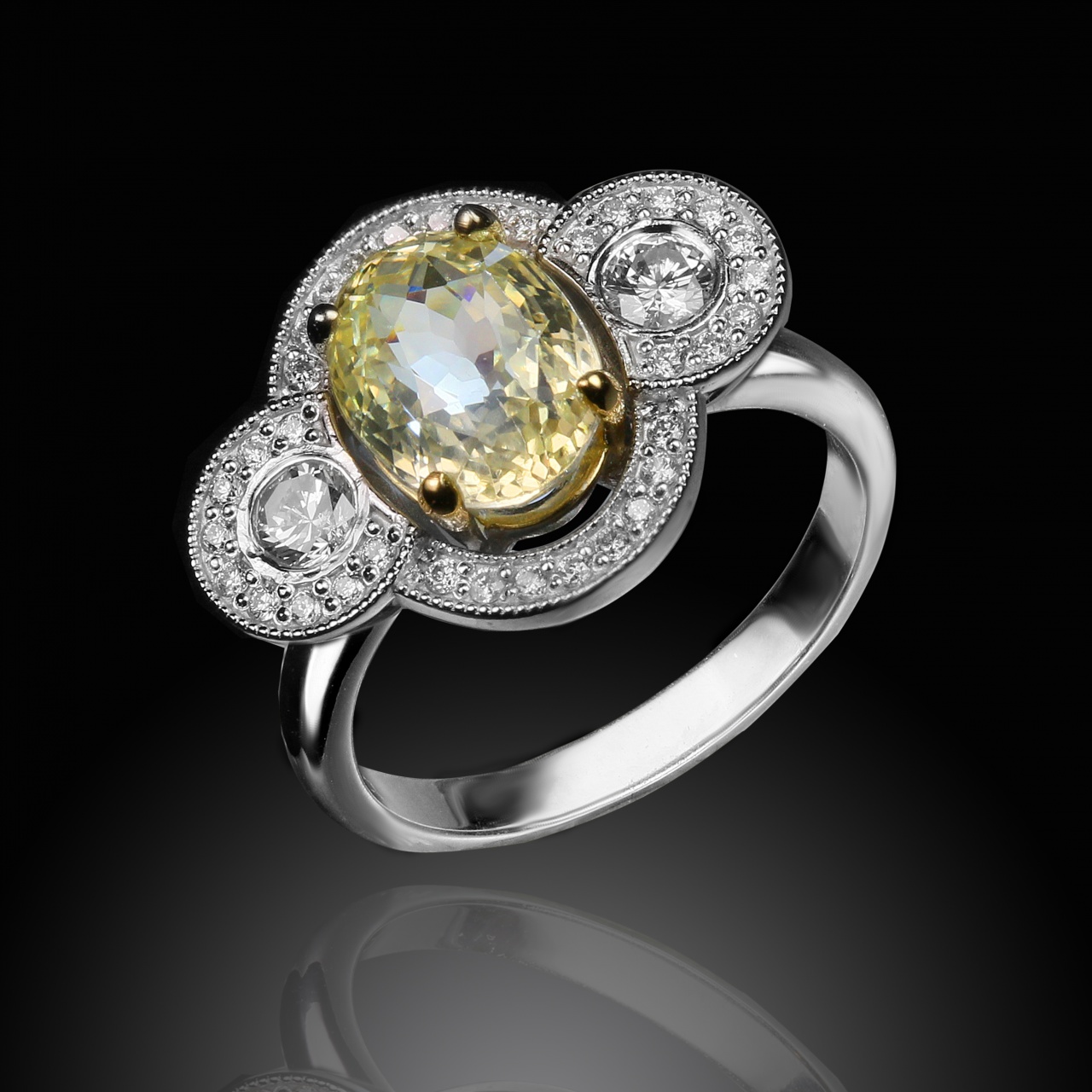 Кольцо из белого золота с желтым сапфиром 3,06 карат и бриллиантами 0,37 карат (сертификат GIA)
