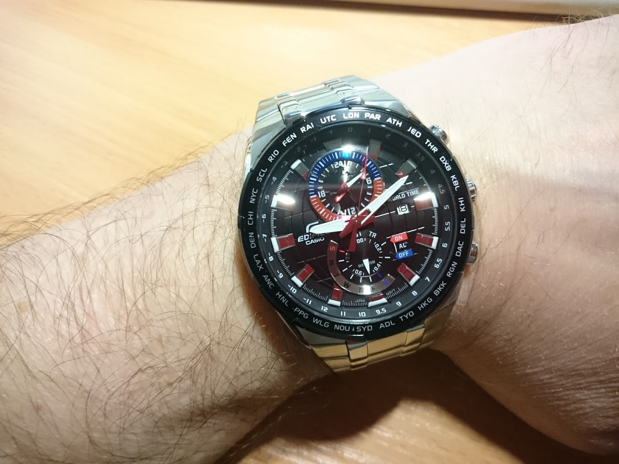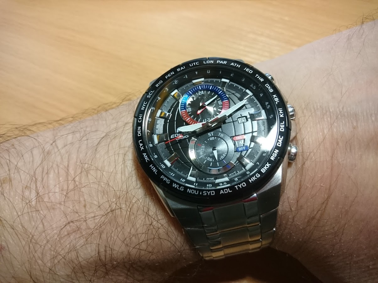 Вдруг, внезапно, потянуло на кварц... И захотелось, чтоб большие и хронограф и, самое главное, чтоб недорого. Стал смотреть Эдифайсы ( Сейки и Ситизен или маленькие, или не бюджетно). Сходил в магаз, поглядел вживую, оказалось, много моделей откровенно мелких, там вообще ничего не видать. Понял, что минимум диаметр должен быть 47 мм, обязательно чёрный безель ( белый уменьшает, имхо). Сильно понравились по картинкам EFR-550D - напомнили недосягаемые UN.На ebay с нынешним курсом руБля на эту модель цены не весёлые. Стал искать Яндексом, но помог империалистический Гугл. В Москве, в одном магазине, в котором я бы и не стал искать часы, был выбор из линейки EFR-550 ( даже синие RB) по гуманной цене. Купил.